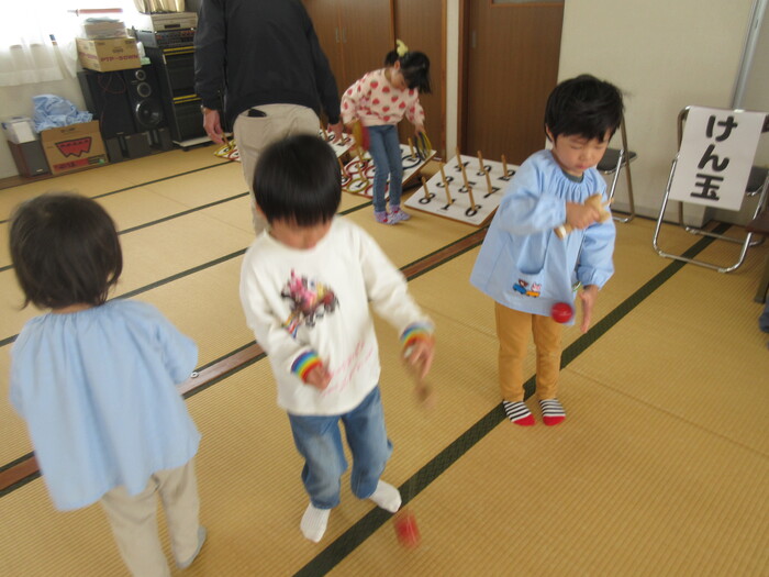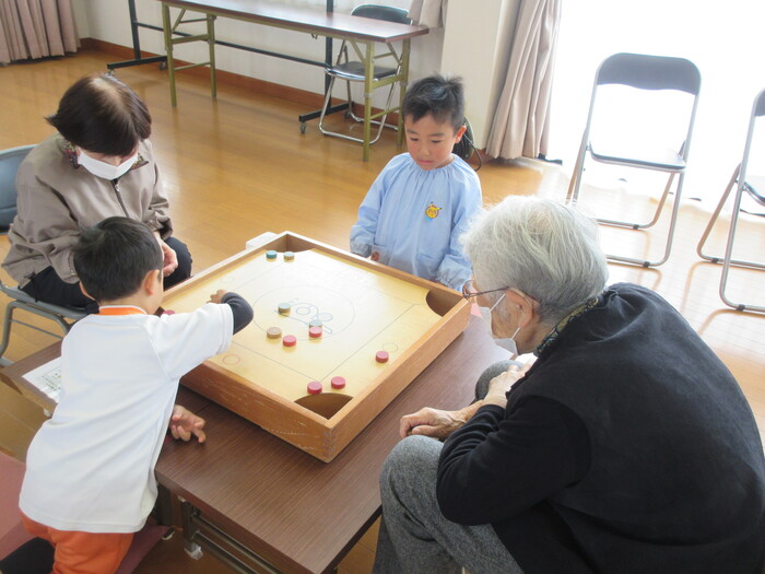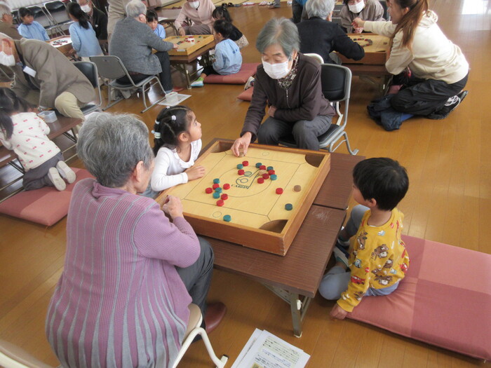 開出今町の老人クラブのみなさんとカロムやけん玉であそびました。 「おじいちゃん・おばあちゃん やさしくおしえてくれてありがとう♡」 | ||