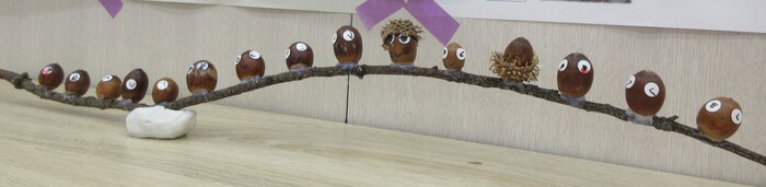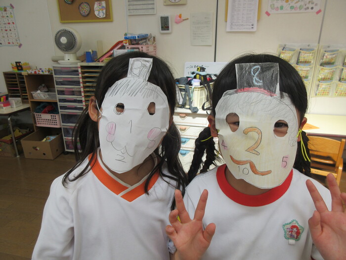 月刊絵本から数字の世界に入り込んでいる子どもたち。お散歩や遠足で見つけた秋の自然物を使いながらお店を開くことに!?身の回りに隠れている数字を探したり、あそびに取り入れたりしながら楽しんでくれています。 | ||