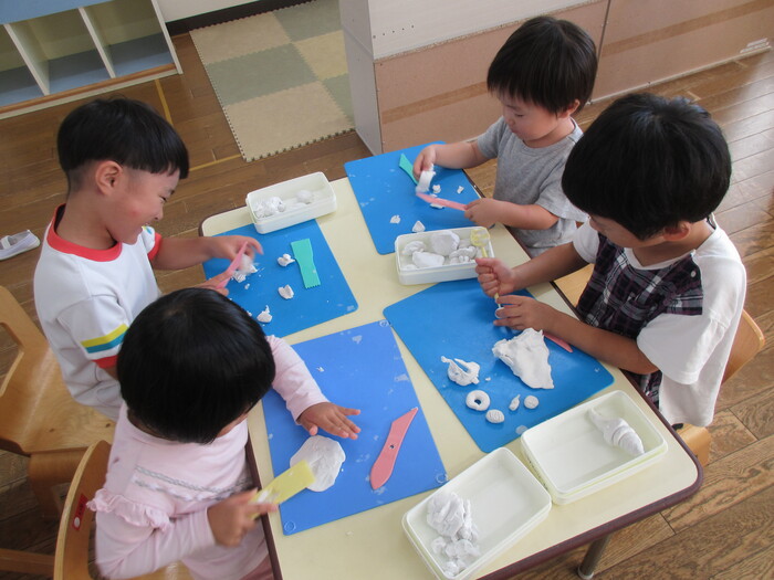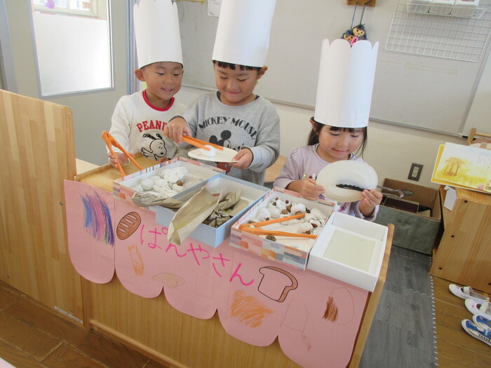 絵本のようにパン屋さんをしよう!となりました。 パンにどんぐりを入れようとたくさん集めて、パンに入れて楽しんでくれていました。 絵本のように粘土をのばしてみたり、型をとってみたりとパン屋さんになりきって楽しんでくれていました。 | ||