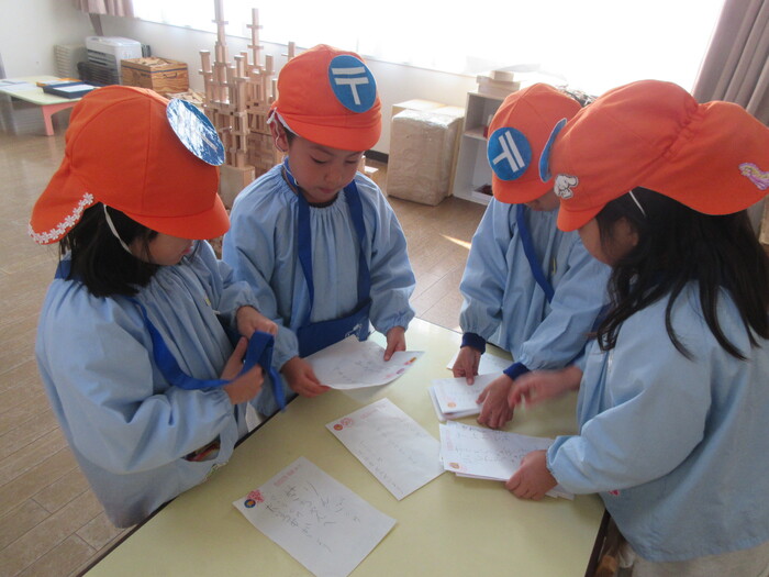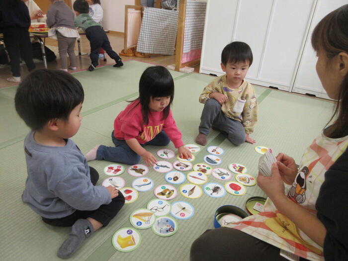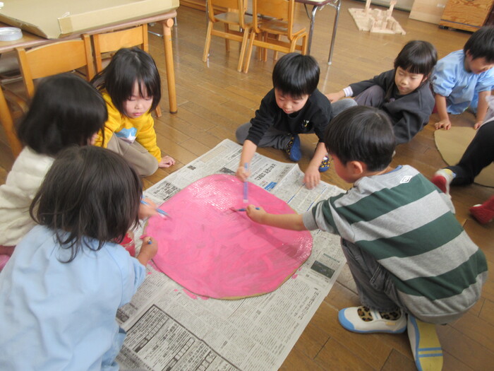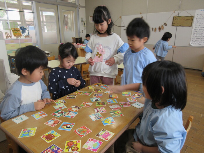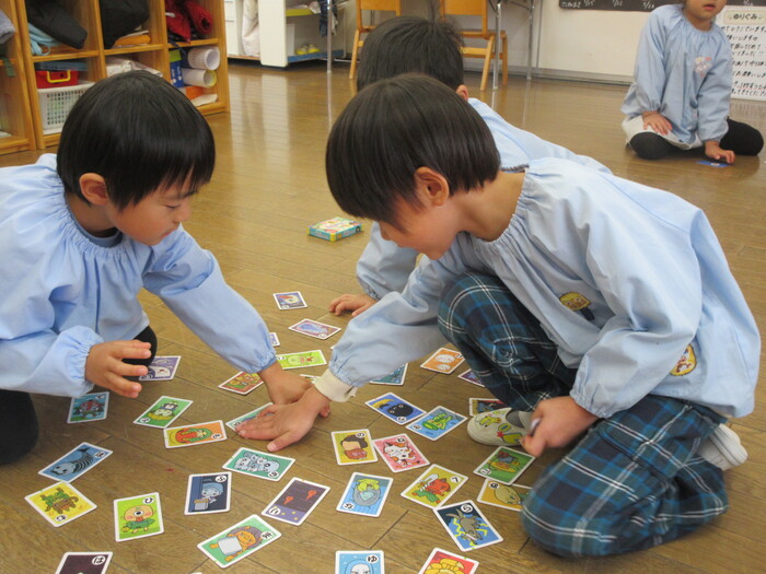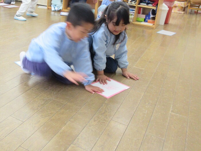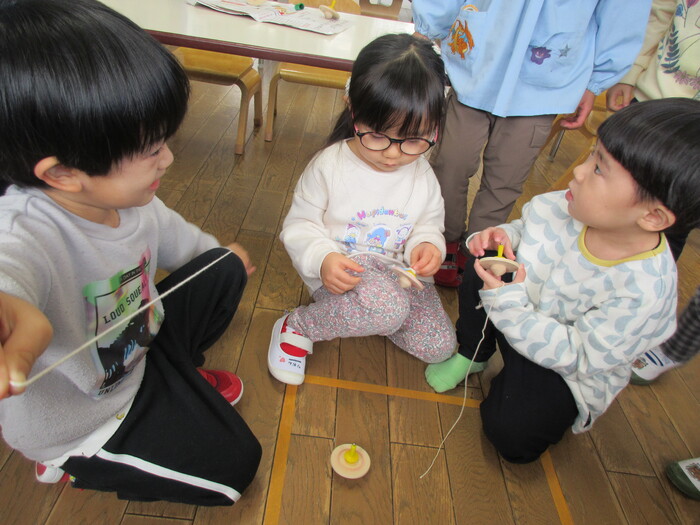 たこあげ、こままわし、カルタなどお正月あそびをたくさん楽しみました。今年はみんなで手作りの大型カルタを作り、「いいね!」とお互いが作った札を認め合う姿が見られました。こままわしでは、友達が楽しむ姿を見て刺激を受け、「できるようになりたい!」と諦めずに何度も挑戦してくれました。出来るようになった時は、とびっきりの笑顔が見られました♪ | ||