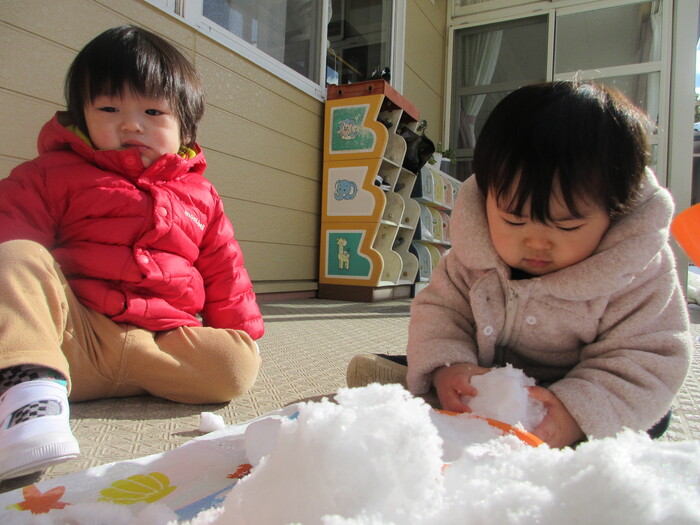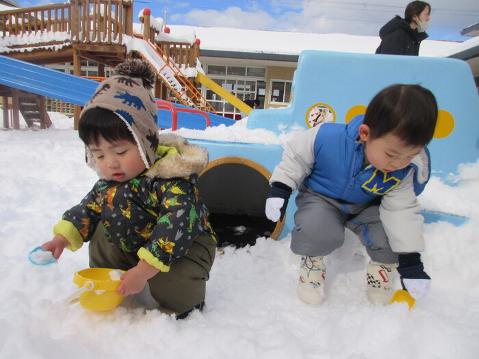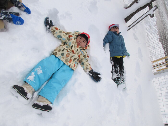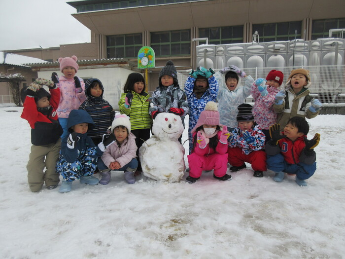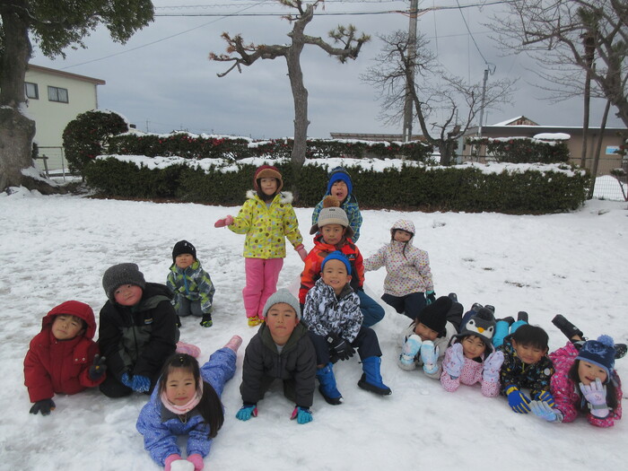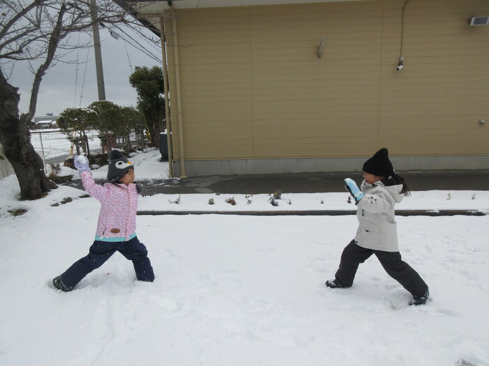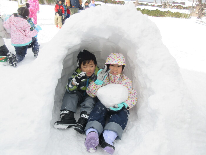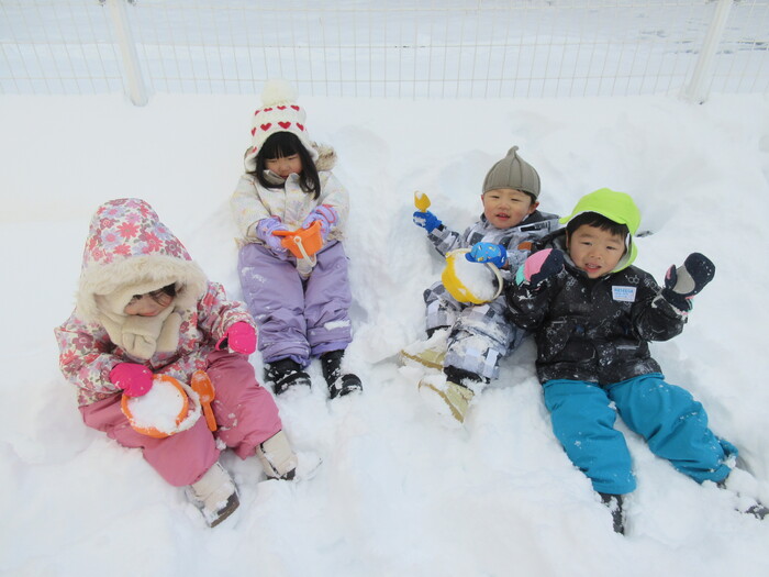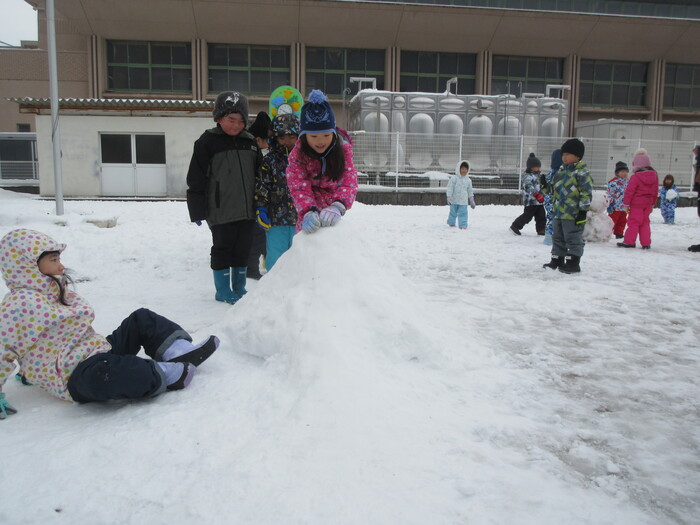 雪がたくさん積もり、楽しみにしていた雪あそび!!「ふかふか~♡」と言いながら、雪合戦・雪だるま・かまくら作りをし、冬の自然現象を思いきり楽しみました。 | ||