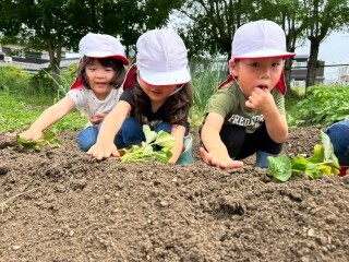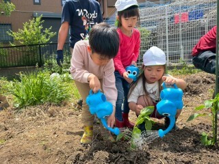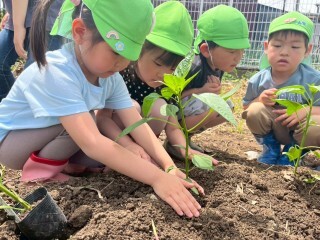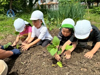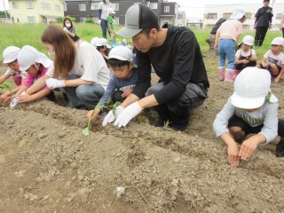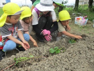 年長児は、今年は保護者の方と一緒にさつまいもの苗植えをしました!