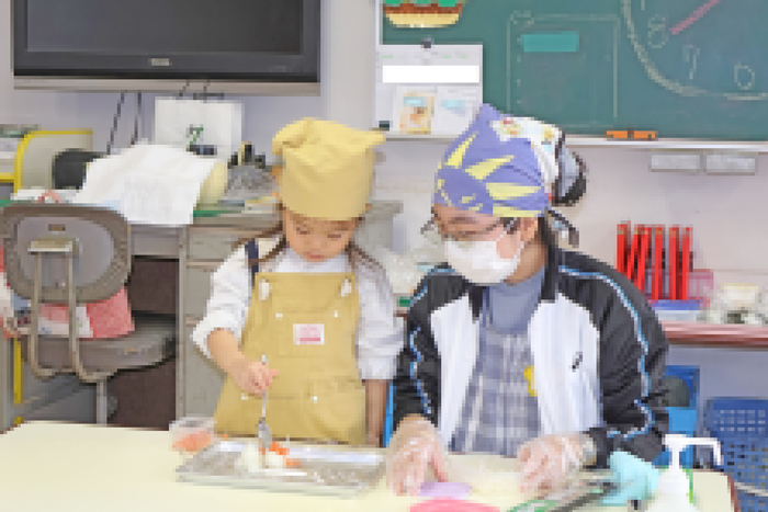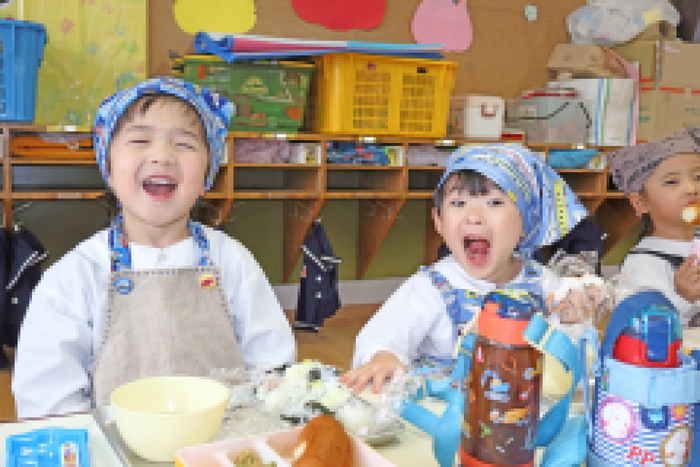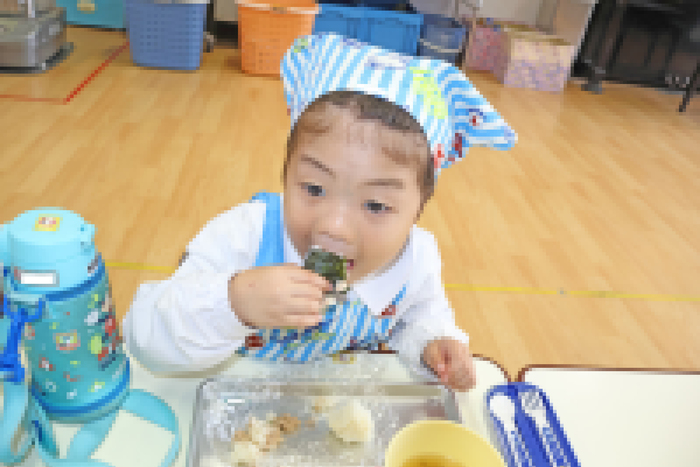 ”年少さん”のクッキングは、「楽しく食べる感覚を育てる」ことを目標にして、皆で楽しさを共有しながらお料理の経験をします。 | ||