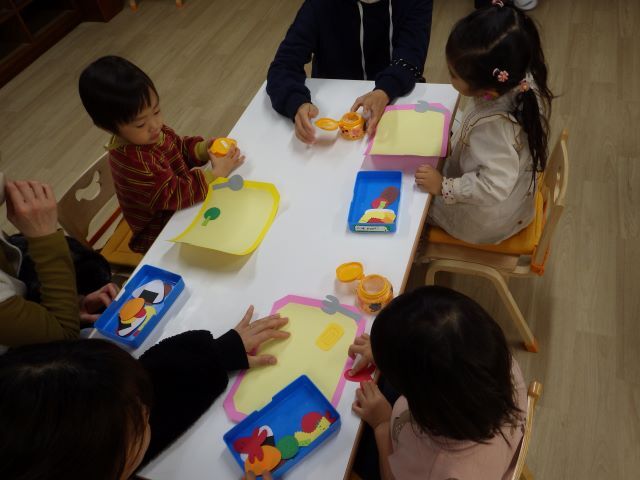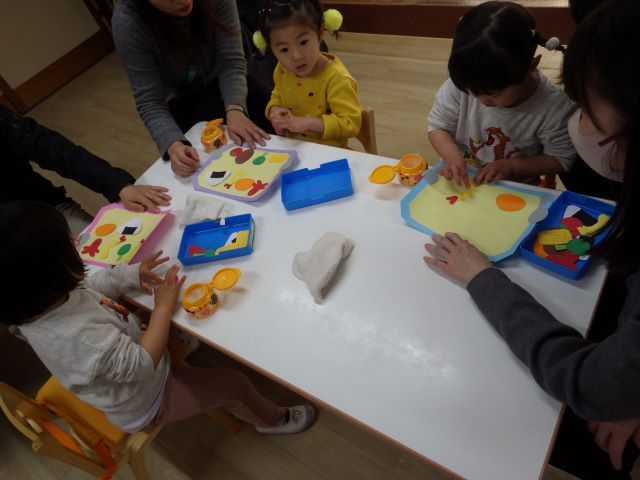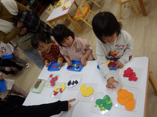 2月19日(木) ひよこ組の保育参観を行いました🐤 お弁当バスの絵本を読み、その後に自分たちのお弁当を作りました🍱お弁当の具を選び、好きなところへ貼りました。足りない子は、おかわりをして、おいしいお弁当ができました🍱保護者の方に見守られて、とても嬉しそうでした👪 | ||