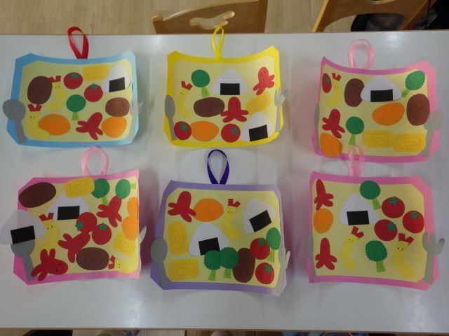 -10月 満3歳児 ひよこ組ー <おまつりごっこの準備> おまつりごっこで売るおもちゃの「ラーメン」作りやはちまき作りをしました。 ラーメン作りでは、麺をぐるぐると描き、具をのせて完成です。それぞれ個性が出ている作品で、どれも美味しそうですね。 はちまき作りでは、身近な野菜(オクラ、レンコン、ピーマン、小松菜、リンゴ)やめん棒を使い、スタンプを作り押しました。好きな色や形にこだわり、素敵なはちまきができました。 | ||