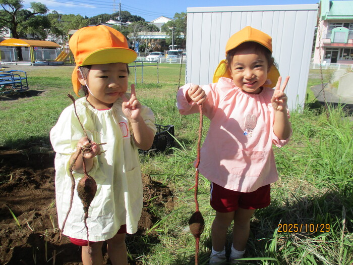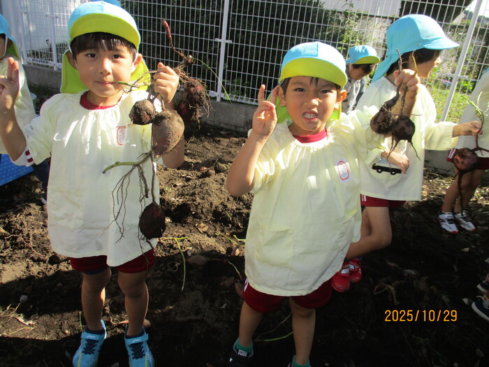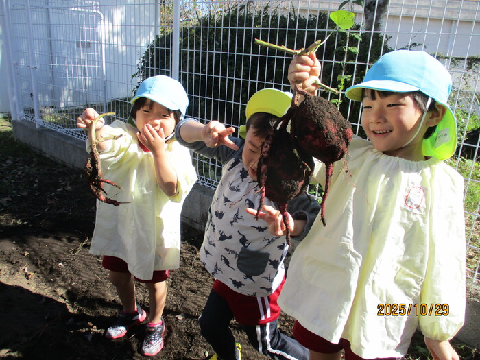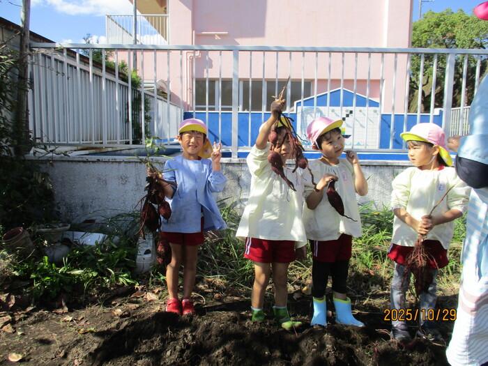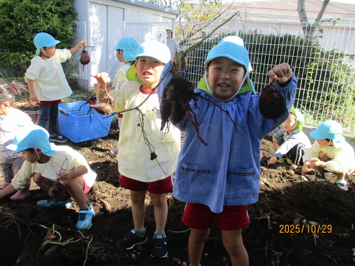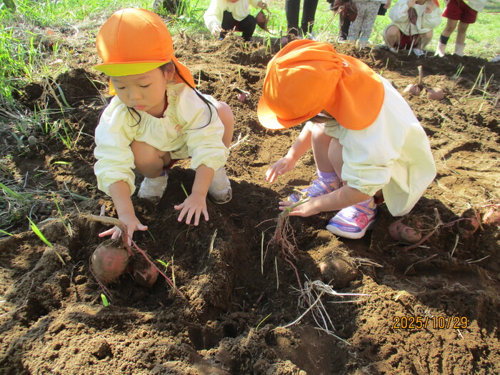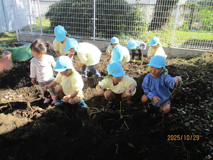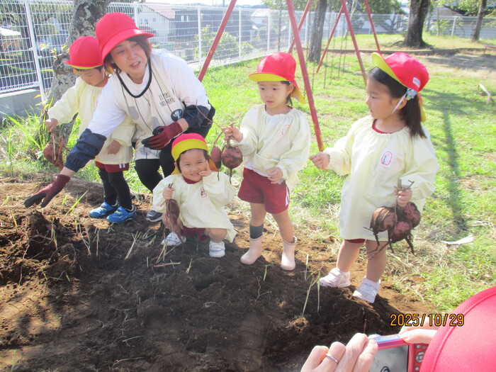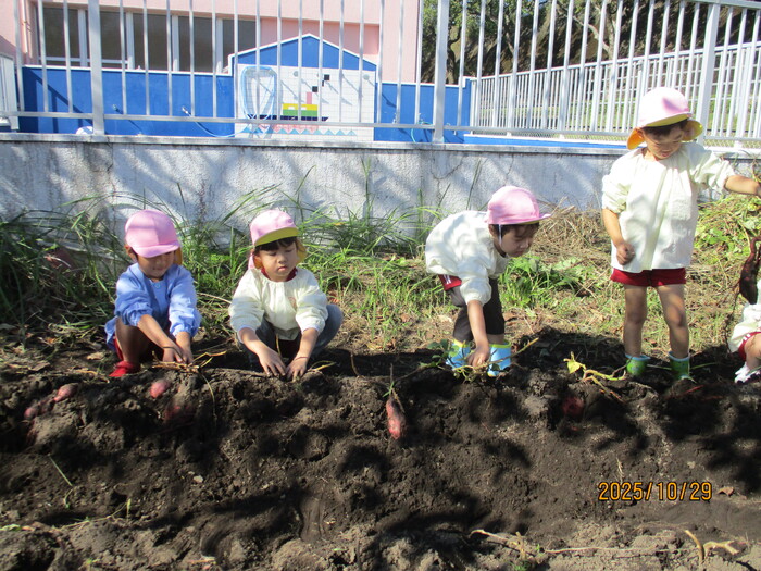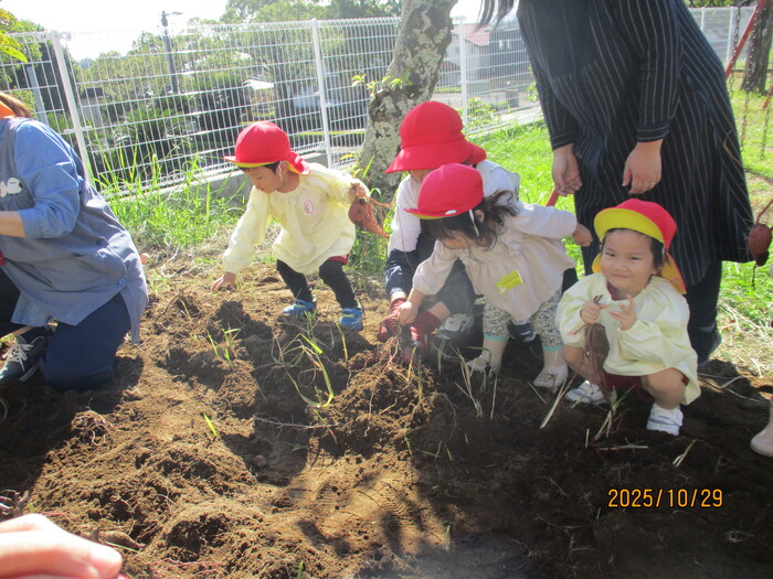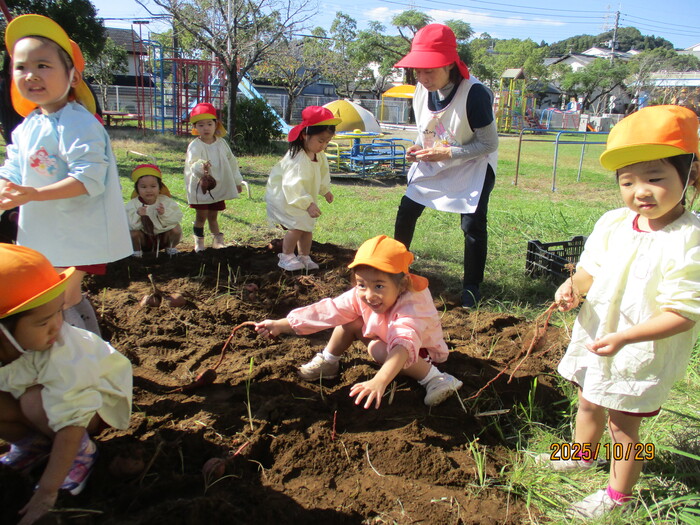 10月29日(水)に5月に幼稚園の畑に植えたお芋の収穫をしました❣🍠子ども達は前からお芋掘りを楽しみにしていました。暑い暑い夏の間に畑の中で育っているかが心配でしたが、、、、、あらどうでしょう~(^^♪すくすくとそれはそれは立派に大きくなっていました~💖バスの先生が掘りやすいように畑を綺麗にしてくれていました。さあ!いざ出発❣ | ||