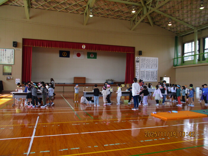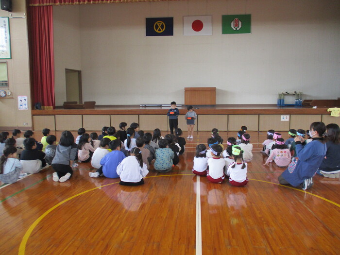 今日は、生目台東小学校交流会に年長組さんが行ってきました❣とても緊張した表情をしていたので掛け声をかけて出発しました!小学校に着くと校長先生が出迎えて下さいました。(一層表情が硬くなったーーーー(´;ω;`)ウッ…)体育館に案内されました。すると今度は、教頭先生がお出迎えでした。緊張マックスになってきたところに開放的な空間に1年生の姿が見えて楽しい雰囲気に包まれました💖さあ!何が始まるのかな~とワクワクしてきましたよ~♪始まりの会は、何と卒園生の子でしたよ!交流会の始まり始まり~♪1年生が5,6、人のグループに分かれていて幼稚園の3グループがそれぞれの班に案内されました。最初に絵本の読み聞かせがありました。 | ||