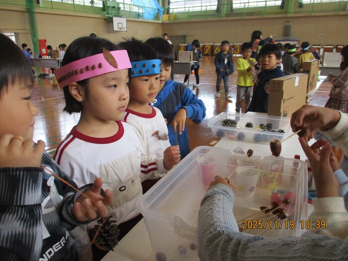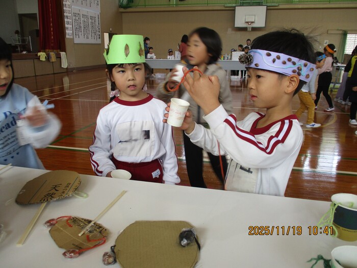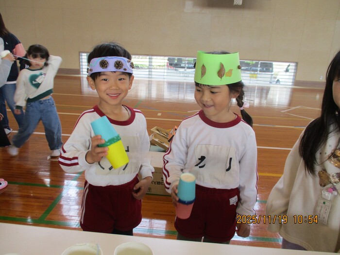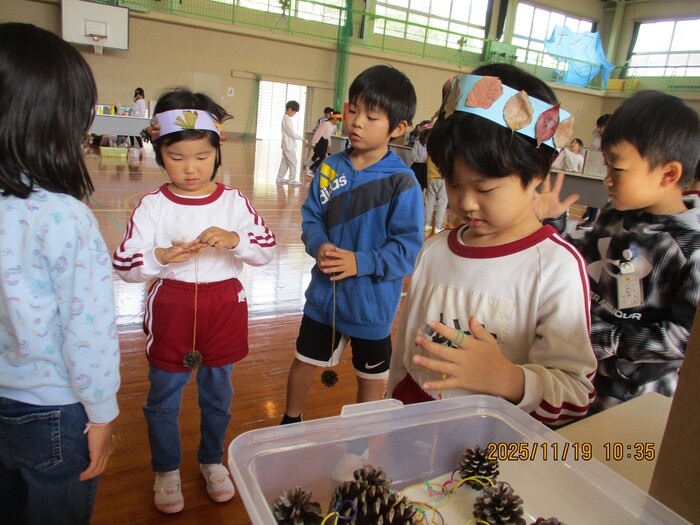 ウエルカム手作り冠をかぶり色々な手作り作品で遊びました💖小学校にある椎の木のどんぐりやまつぼっくりが使ってあるおもちゃがたくさん並んでありました!どんぐりのやじろべいやまつぼっくりの紙コップけん玉、オナモミのダーツ、どんぐり迷路等々たくさんの遊びコーナーを大満足しました! | ||