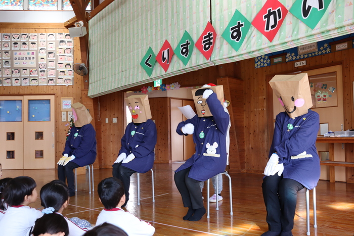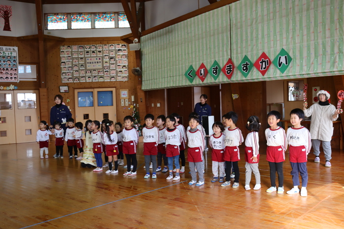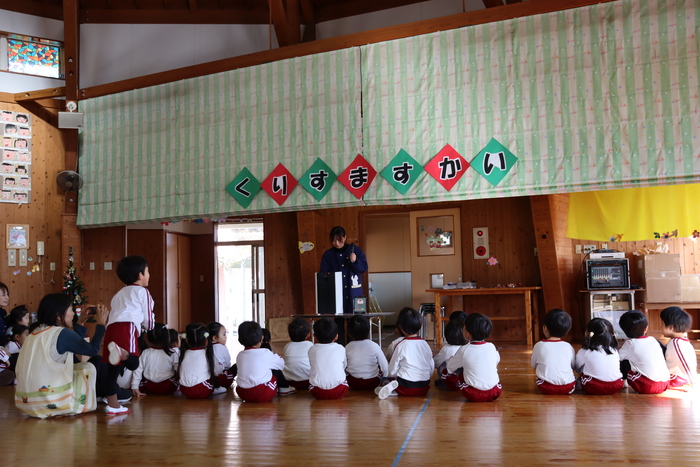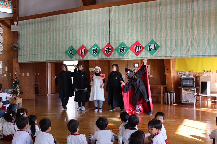 「クリスマス会🎄」~先生たちの劇は、ハリーポッターでした!悪者が園長をドビーに変えてそれをのハリー・ロン・ハーマイオニーの魔法使い3人が助けに来て最後はハッピーエンドで仲良くなるというお話でした~😊迫真の演技の先生たちに子ども達は釘付け、、、(少し怖かったかな~)次は、先生たちが紙袋にお顔を描いて被って登場!!同じエプロンで椅子に座っていたので子ども達は分からない様子、、、?なかなか当たりませんでしたよ~(・∀・)最後には、まさかの!!サンタさんからのサプライズ電話❣お利口さんにしているとプレゼントを届けてくれると言われて目をまんまるくして聞き入っていましたーーー💖終わりにはあわてんぼうのサンタクロースの歌を歌って幼稚園からのプレゼントに大喜びの子ども達でした💖🎄 | ||