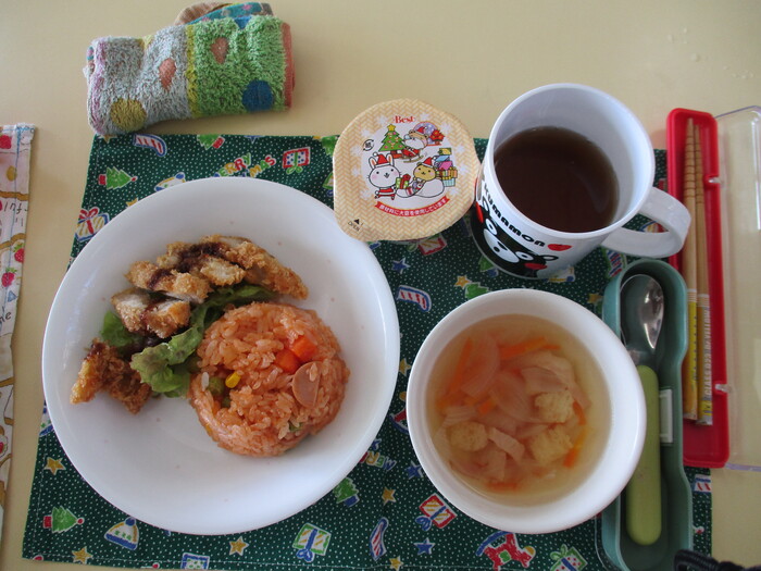 クリスマス会の日の給食献立🎄さくさくちきんかつ・そえやさい・おにおんすーぷ・けちゃっぷらいす・くりすますでざーと・でした😊 | ||