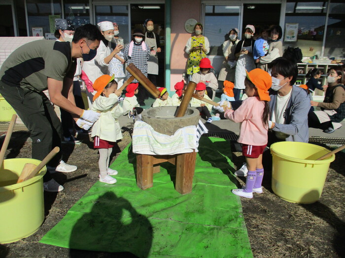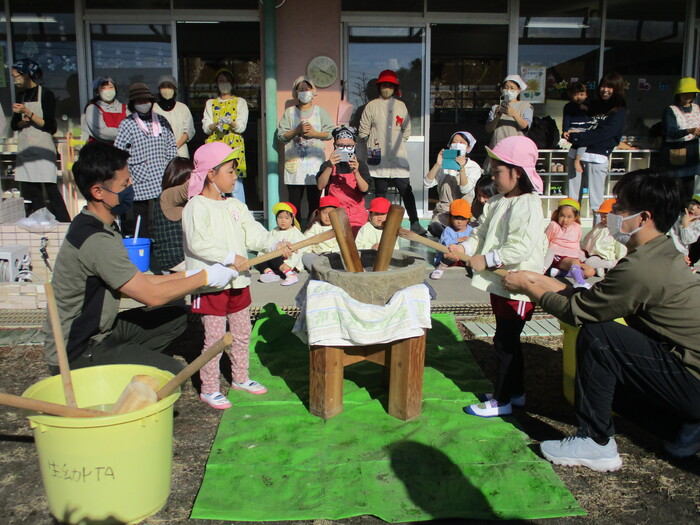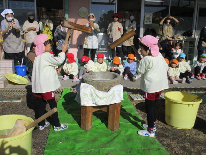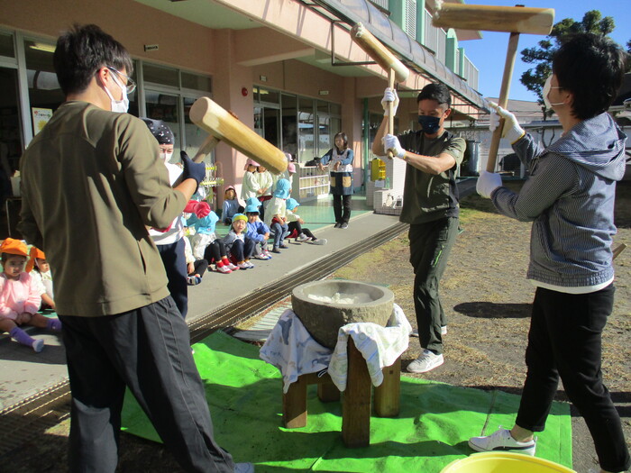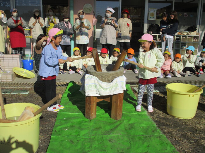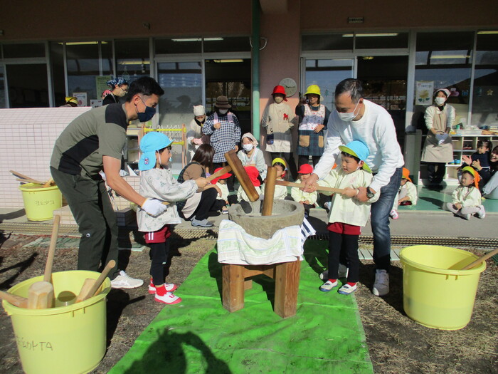 「もちつき大会」~係の保護者の方が何回も準備をして下さり当日を迎えました。今年は、保育日初めてのお餅つき大会で鏡餅づくりに挑戦しましたよ!!お手伝いの保護者の方もたくさん来て頂き昔ながらの石臼と杵でつきました最初は、力持ちのお父さんについて頂き蒸したてのもち米がどんどんお餅になっていきました~😊さあ!いよいよ子ども達がつく番になりましたよーーーーー!!楽しみ楽しみ~💖 | ||