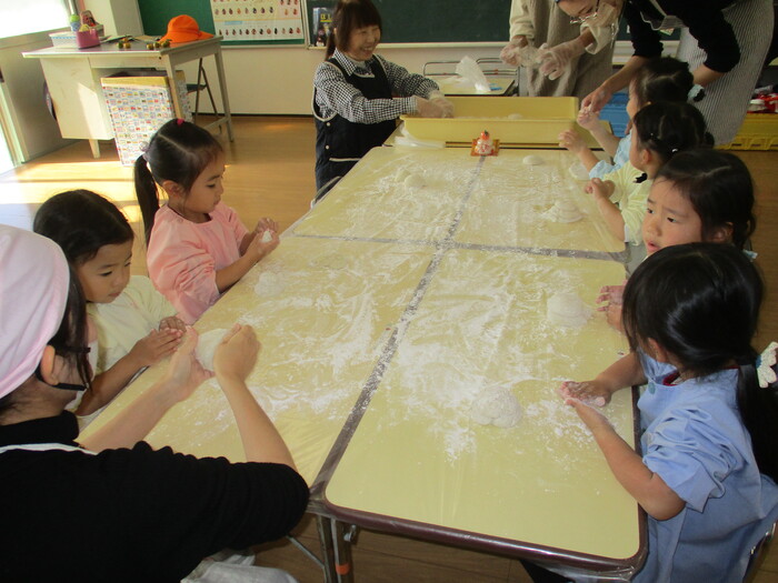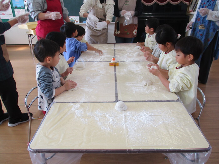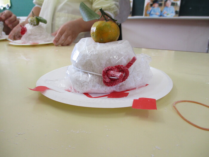 つきたてのお餅を教室に分けて、、さあ!いよいよ!鏡餅づくりスタートです。お母さんたちのアドバイスを聞いてまるめましたよ~😊立派な鏡餅にどんどん仕上がっていきましたーーーー!係のお母さんの手作り水引きがとても綺麗で素敵でした💖(こんなところまで気配りして頂き本当に感謝です💖) | ||