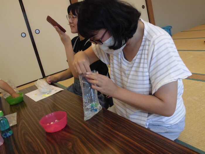 7月2日のみんなの広場は、感触遊び「センサリーバック」を作ろうでした。「センサリー」って聞いたことがありますか?「知覚・感覚」という意味があるんです。センサリーバックは、「見る」「触る」「聴く」などの様々な感覚遊びを通して脳が活発に刺激されます。今回は腹ばいの赤ちゃんから2歳のお友だちが遊べるものをお母さんと一緒に作りました。 初めに保存袋に保冷剤を入れて、その中にビーズや魚、おはじきなどを加え、最後にテープで被い完成です! 窓に貼って光に透かしたり、冷蔵庫で冷やすと新しい感覚が味わえますよ! ぷにぷに、ムニュムニュの気持ちよさやアイテムがゆっくり動く様子に目を輝かせてくれるでしょうね。 | ||
