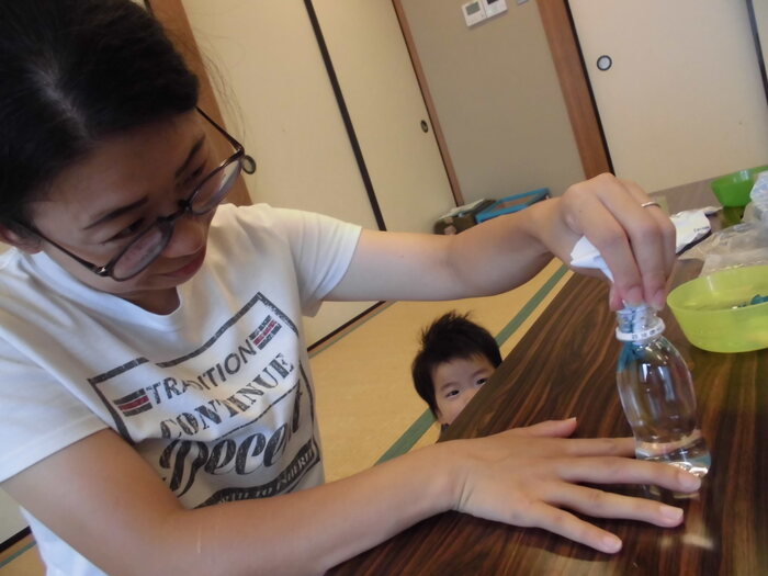 次はセンサリーボトルを作りました。水性サインペンで色を塗ったペーパーを水の入った容器に浸すと、あら!不思議! きれいな色水ができました。その中にビーズやビー玉、ラメを入れると完成です。上下に揺らすと中のビー玉などが揺れてとってもきれいなんですよ。みんなで出来上がったセンサリーバックとボトルで楽しく遊びました。 | ||