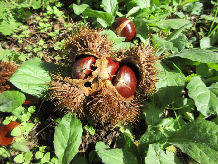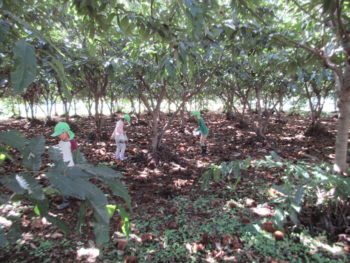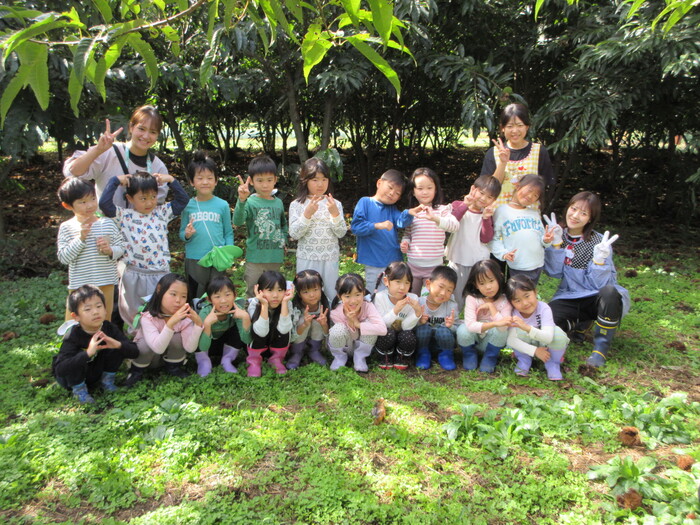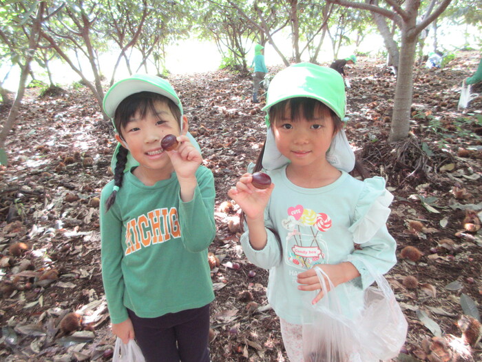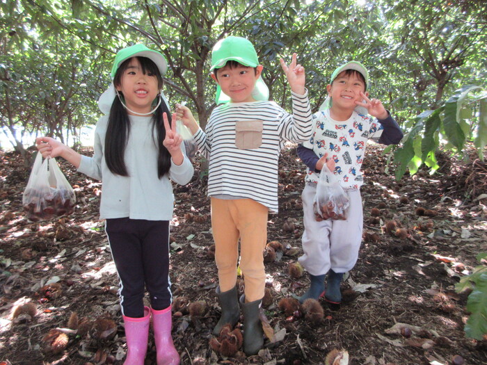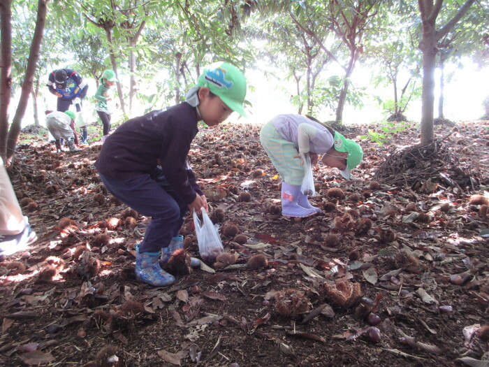 10月2日(木)にきりんぐみ(5歳児)が栗拾いに行ってきました! 今年はたくさんの栗が実り、子どもたちは「大きいのみつけた!」「栗ってツルツルしてるね!」「イガの中に何個栗が入っているかな?」と目を輝かせながら夢中で栗を拾っていました♪ 秋の自然に触れながら楽しむことができました! | ||