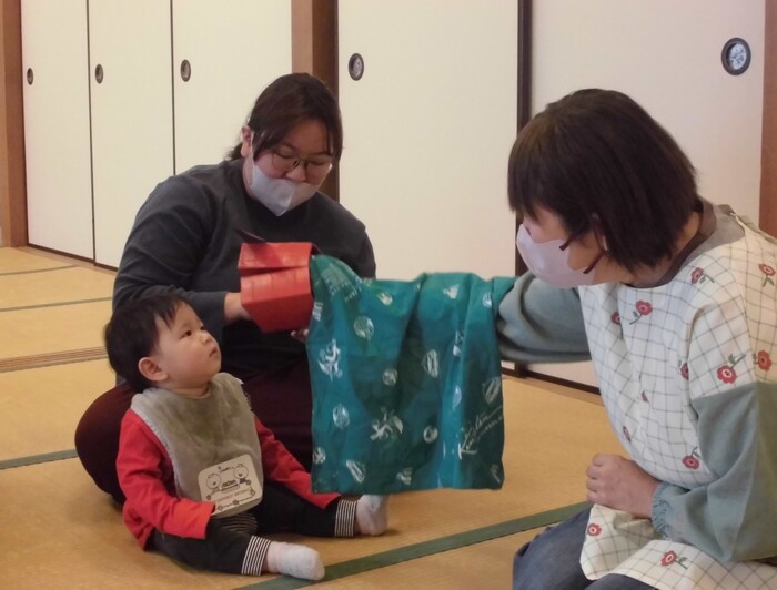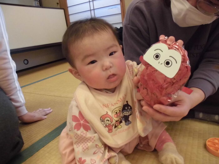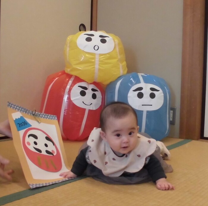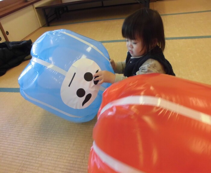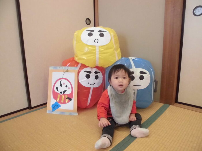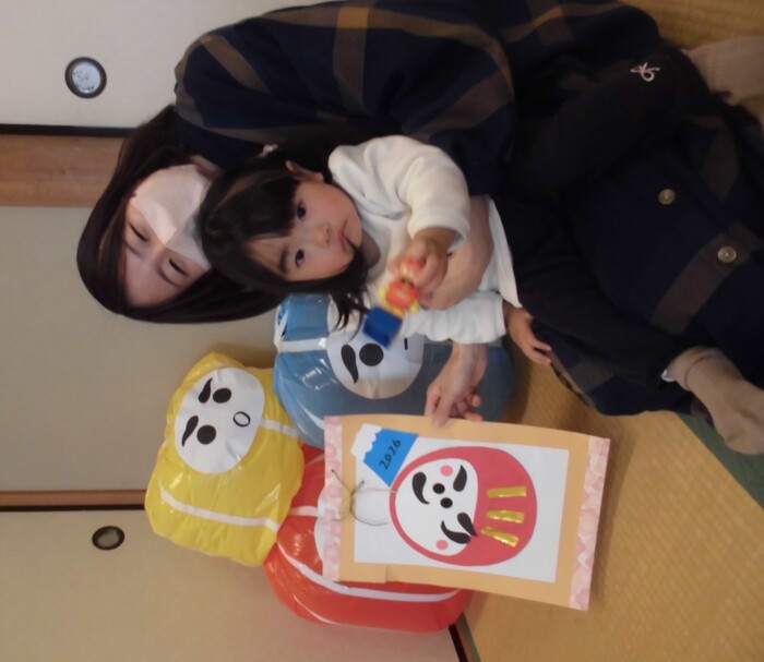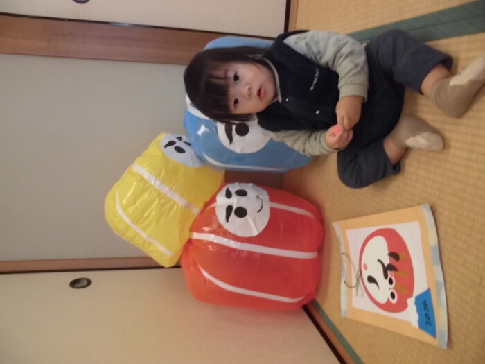 制作の後は、だるま風船やだるまのお人形、獅子舞で遊びました。大きく膨らませてカラーポリ袋にビニールテープを貼ると「あら不思議!」。ポンポン跳ねる風船に変身するんです。保育者と一緒に空中に投げたり、転がしたり大興奮。お花紙で作ったふわふわだるまは小さな手でも持ちやすくて気に入ってくれたようですね。みんなで楽しく過ごしました! | ||
