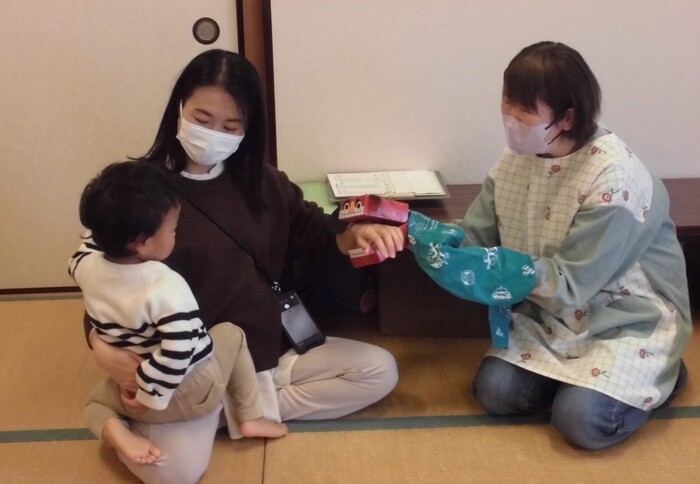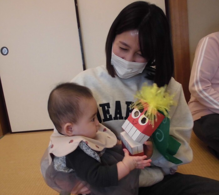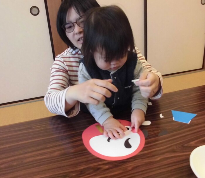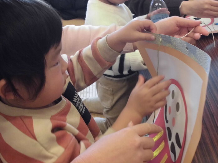 保育園の手作りおもちゃで遊んでいた年齢の大きな子どもたちも「福笑い」に挑戦です!遊んでいたおもちゃを持ったまま参加したり、自分で糊付けをしたり、ひもを通したりやる気満々の様子。自分でやることが楽しくて、お母さん方が見守る中、集中してやる姿を見ていると成長を感じました! みんなすごい! | ||