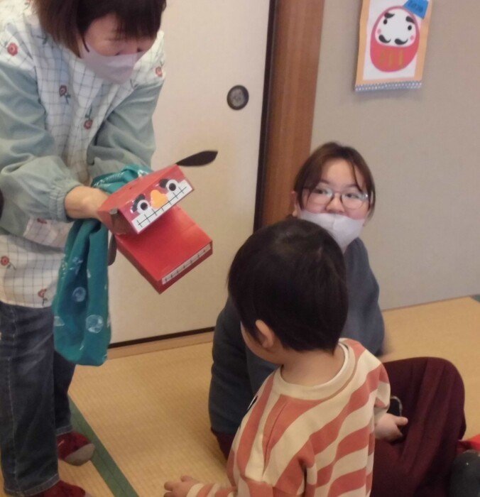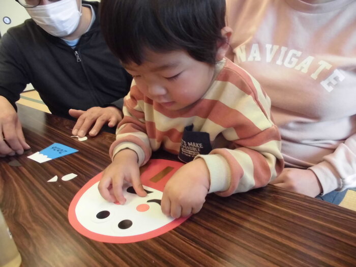 ・だるまの製作が可愛くて、お家に飾って楽しみます。 ・同世代の子どもやい母さんとお話が出来て良かったです。 ・手作りおもちゃも参考になります。 ・だるまを福笑いのように上手に貼れて成長を感じました。 ・少しずつ慣れてお友だちと遊べるようになるといいなと思います。 皆さんに楽しんでいただけて担当者も嬉しかったです! 今年度の「みんなの広場」も残すところ3回となりました。 最後までよろしくお願いいたします。 | ||