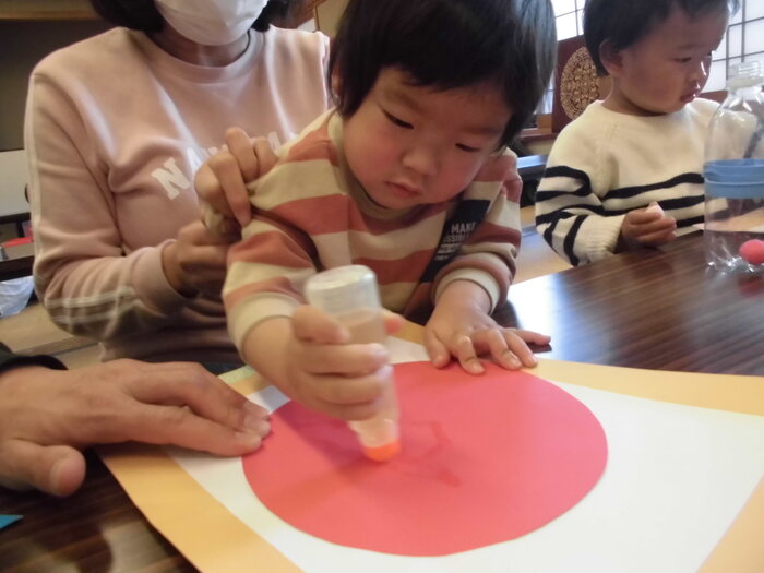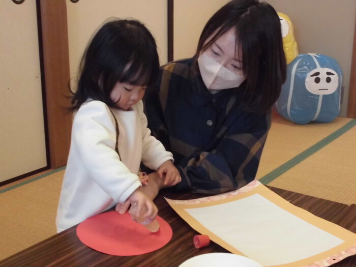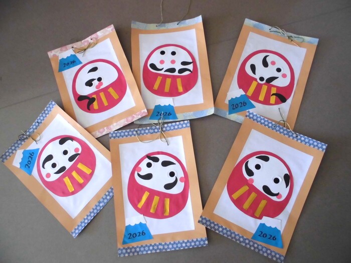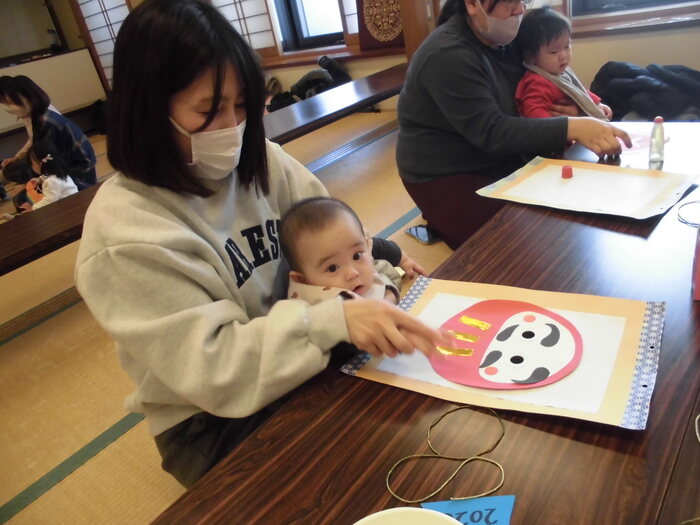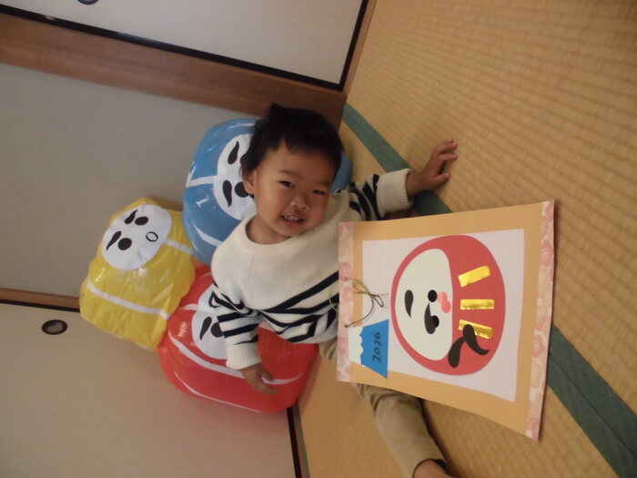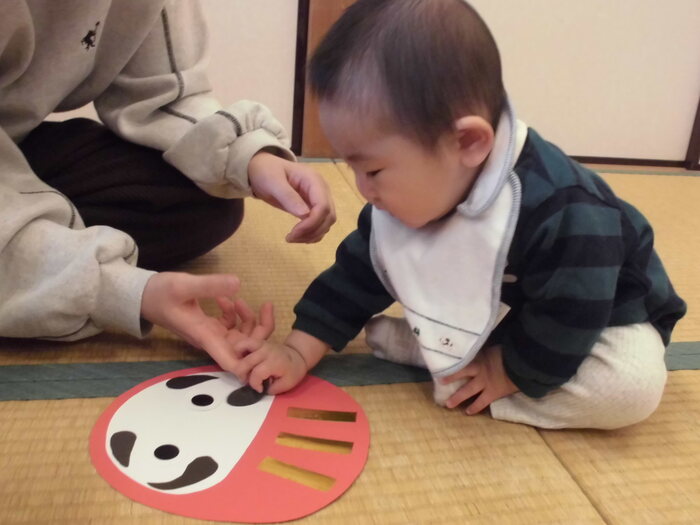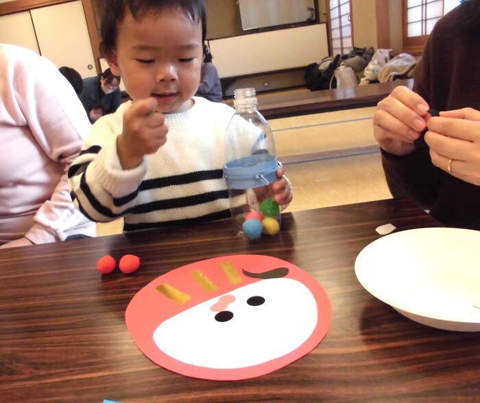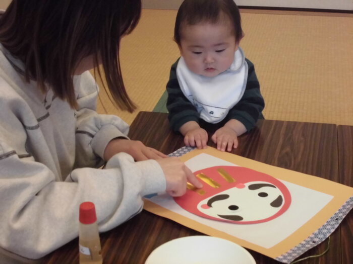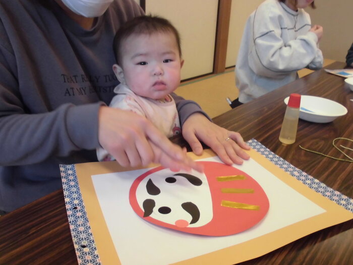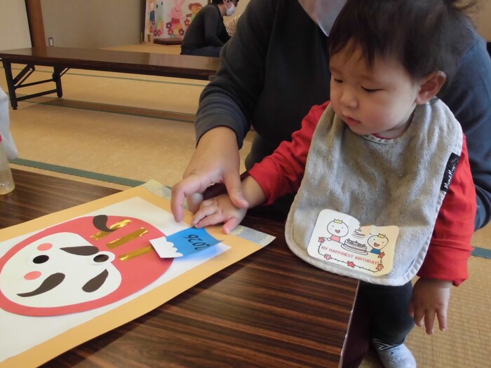 新年のご挨拶の後、だるまさんの顔にそれぞれのパーツを貼って「福笑い」を作り、台紙にだるまさんと富士山を貼って完成です! 小さなお子さんはお母さんに手伝ってもらい、小さな手で貼っていました。手にくっついたシールが偶然にもだるまさんの顔にペタ…眉毛が曲がったり目がお腹にくっついたりしましたが、これも記念ですよね! | ||