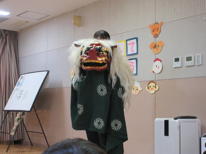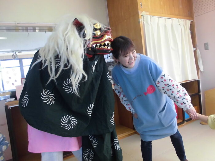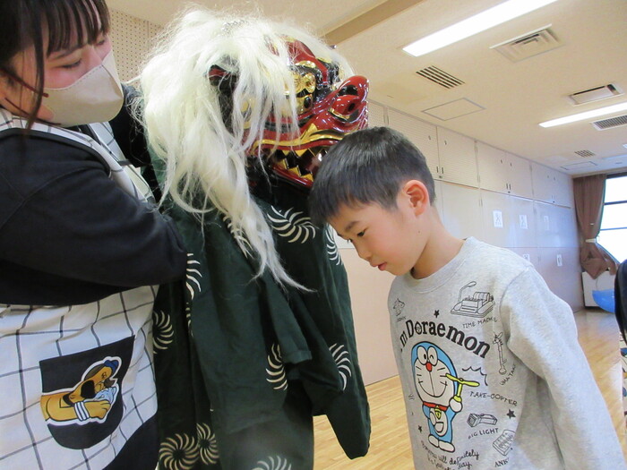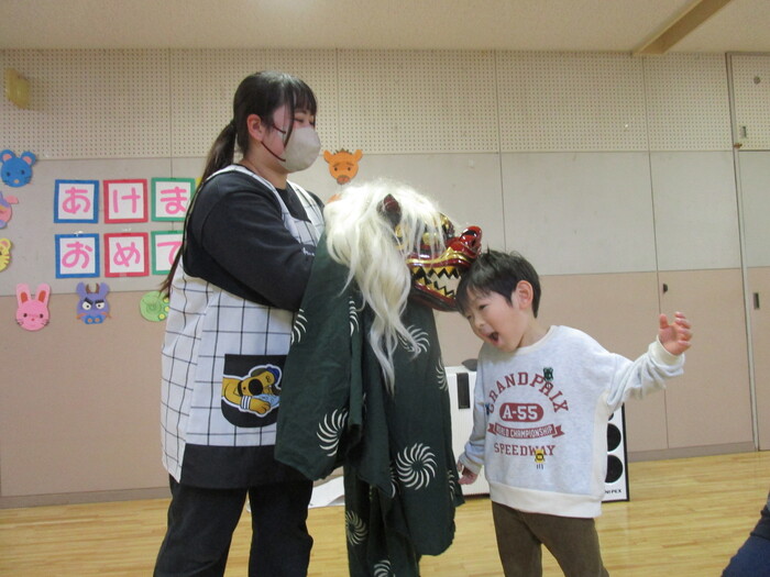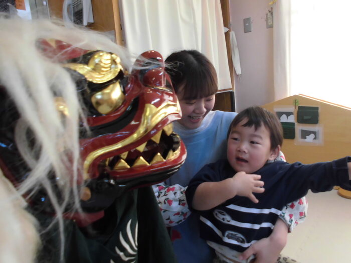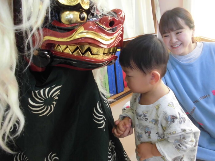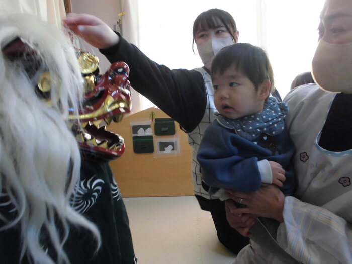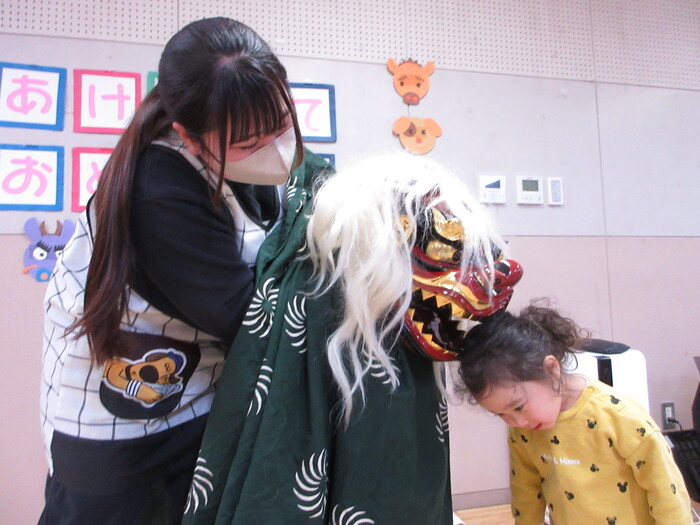 いざ、お獅子が登場すると緊張して いる様子もありましたが、 先生と一緒なら大丈夫💛 パクっと頭を噛んでもらい、無病息災を願いました♬ | ||