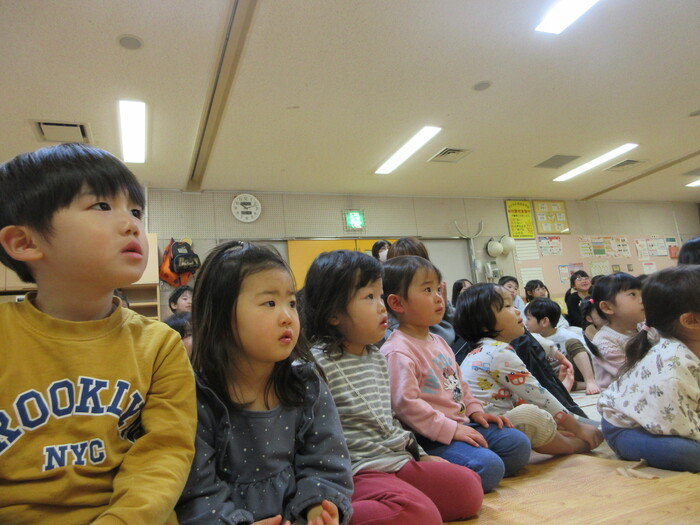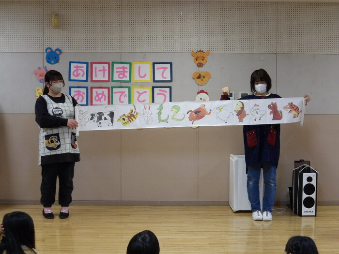 新しい年を迎え、保育園では1月8日に新年の集いを行いました★ お正月のあいさつを元気にしたり、干支のお話をパネルシアター などクイズもあり楽しく参加しました! | ||