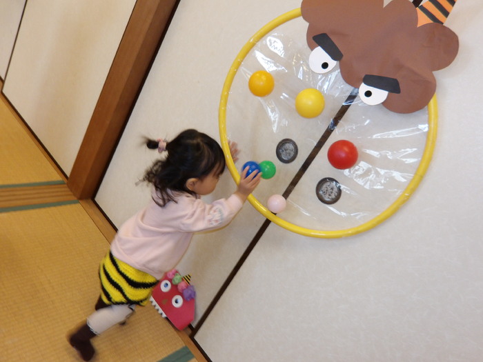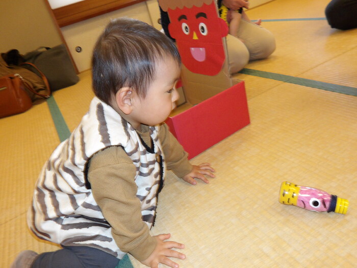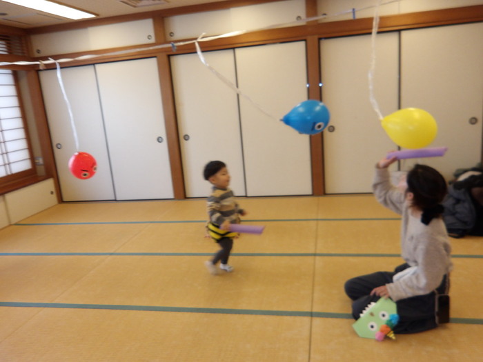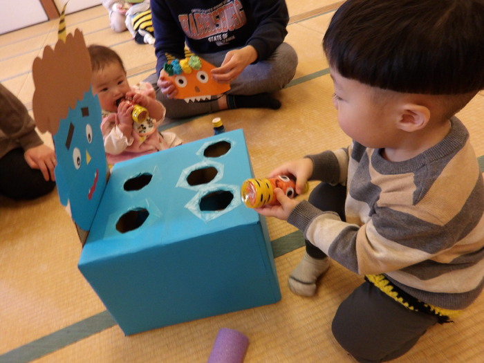 「まめまき」と言っても赤ちゃんから小さいお子さん、みんなが楽しめるように今年は年齢や発達に合わせて4つの「鬼」を用意しました。初めは「なんだ…なんだ…」とじーっと見ていたのですが、保育者が「おには~そと!」「ふくは~うち!」と言いながらボールをそれぞれの鬼に投げたり、入れたり、くっつけているのを見ると、子どもたちのやる気スイッチON!!🔥🔥 勢いよく風船鬼を叩いたり、フラフープ鬼(中はテープが貼ってあります)には豆に見立てたボールをくっつけたり、ボトル鬼を箱に入れたりとそれぞれの鬼退治を親子で楽しんでいたんですよ!手作り鬼のパンツも好評で、みんな「鬼さん」に大変身!可愛い写真がたくさん撮れてお母さん方も嬉しそうでした❤ | ||