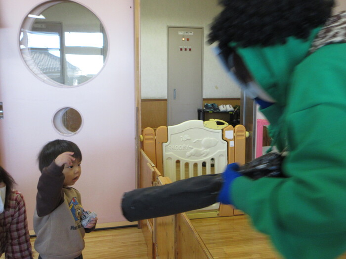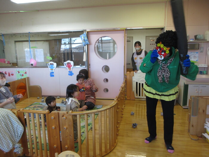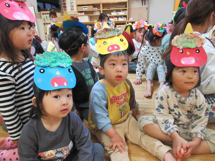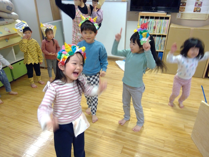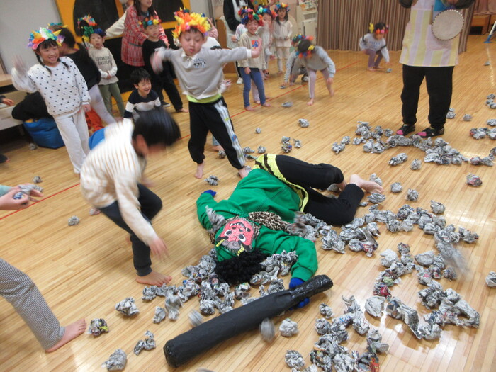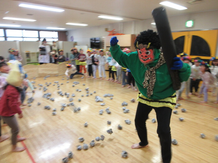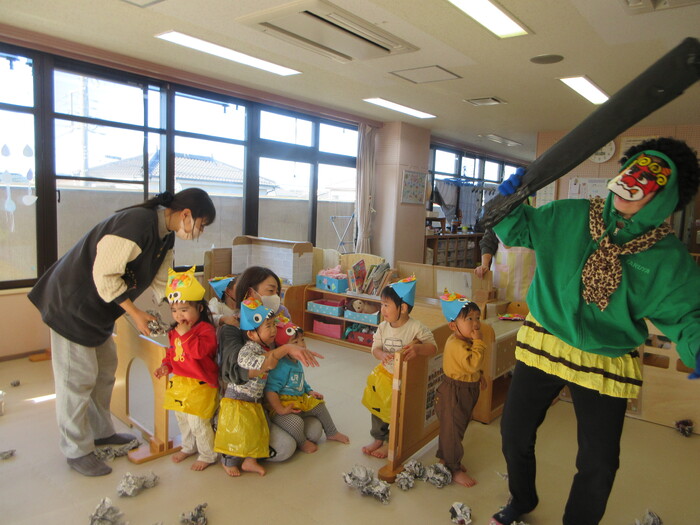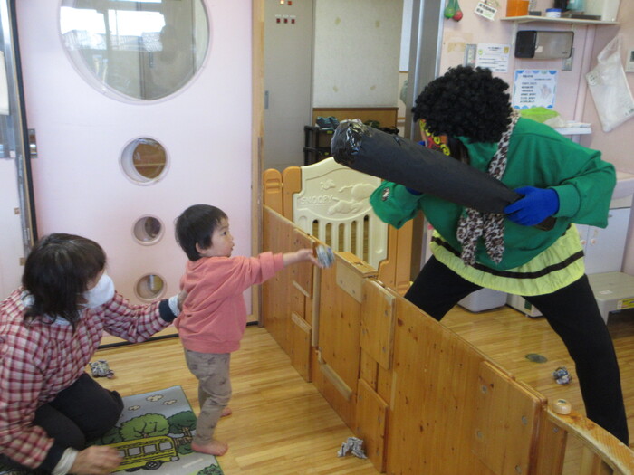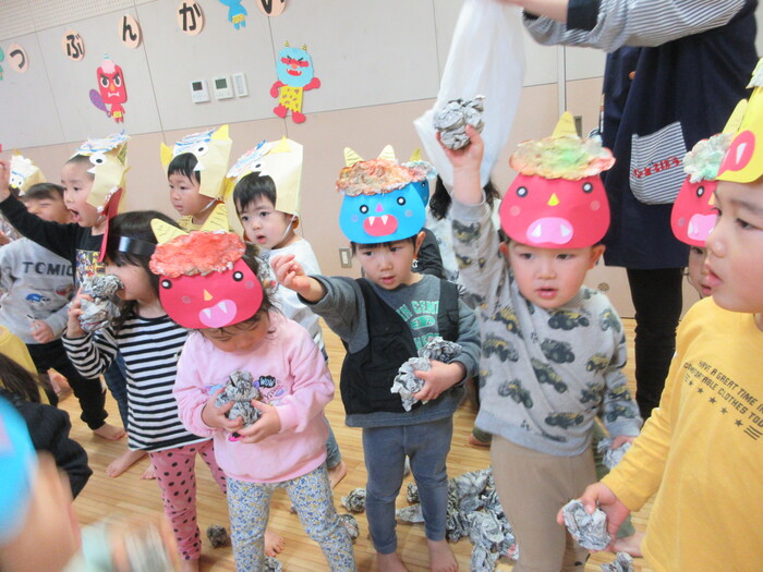 2月3日に節分集会がありました。 節分の由来、ヒイラギやイワシのお話を聞いた後は、みんなで豆まきの歌を唄いました♬ いざ、鬼が登場すると驚いている子もいましたが、勇ましく豆をまくことができました♡ その後は、鬼と仲良く『鬼のパンツ』を踊ることができました。 | ||