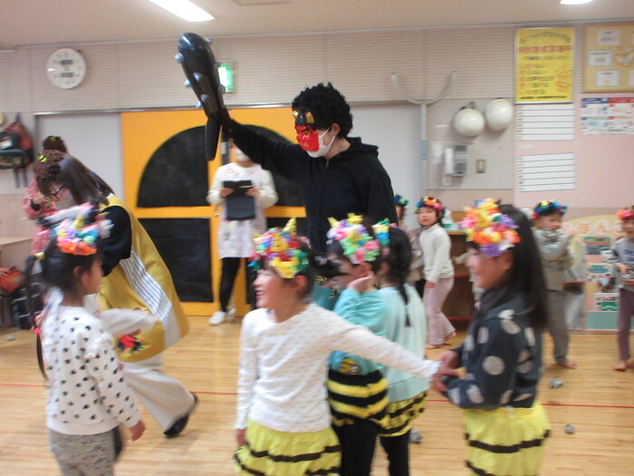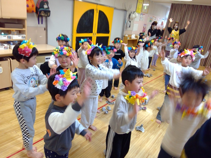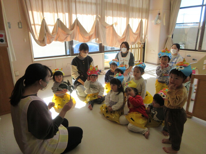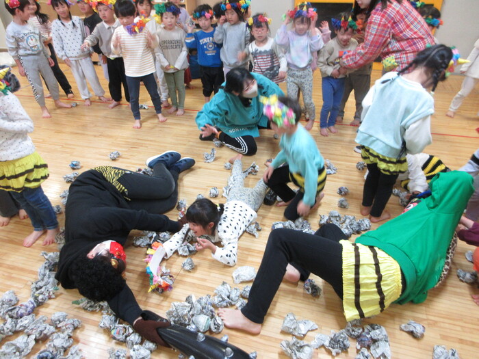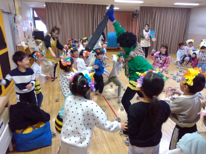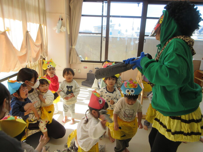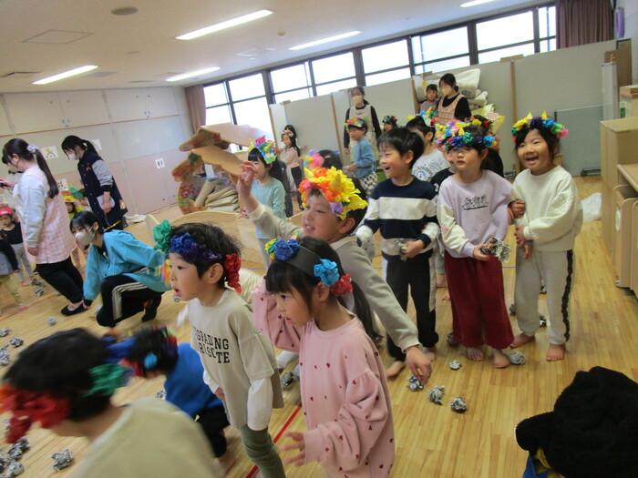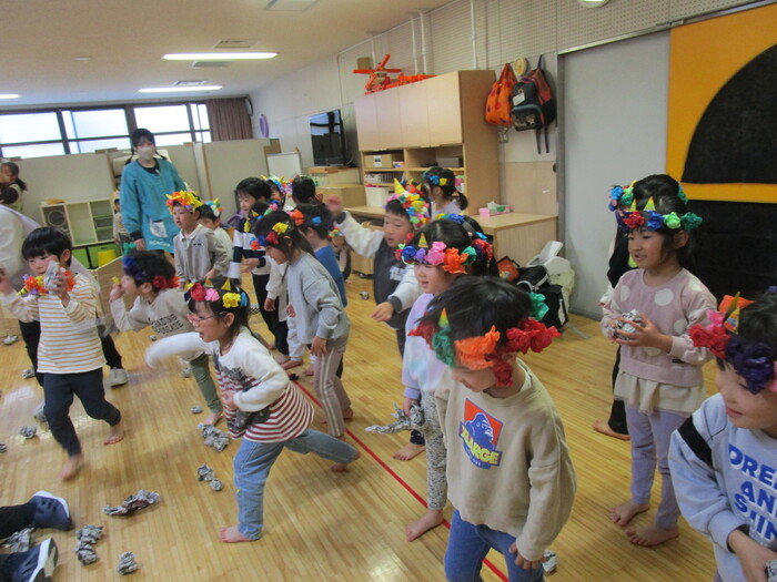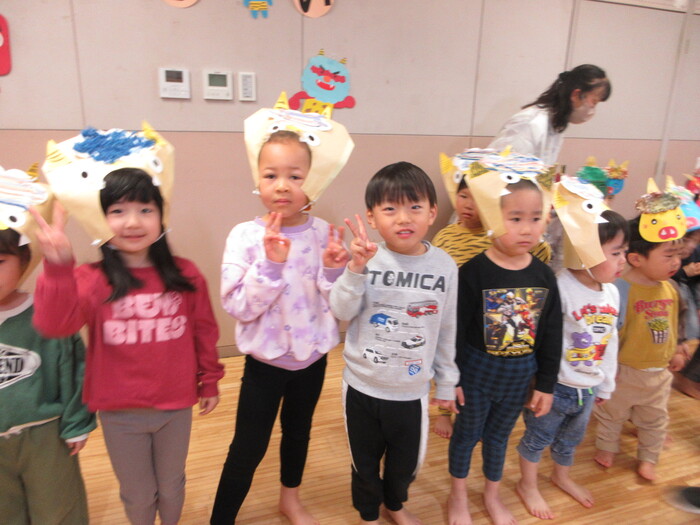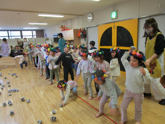 2月3日に節分集会がありました。 節分の由来、ヒイラギやイワシのお話を聞いた後は、みんなで豆まきの歌を唄いました♬ いざ、鬼が登場すると驚いている子もいましたが、勇ましく豆をまくことができました♡ その後は、鬼と仲良く『鬼のパンツ』を踊ることができました。 | ||
