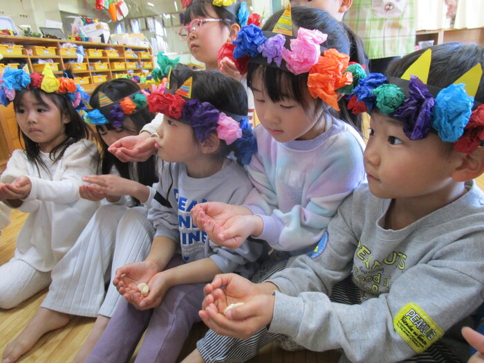 ♪鬼を退治した後は、お部屋に戻ってポリコーンを食べました♪ ※窒息や誤嚥防止のため、子どもたちがまく豆、食べる豆は、 新聞紙やポリコーン(ポップコーン)で代替しています。 | ||