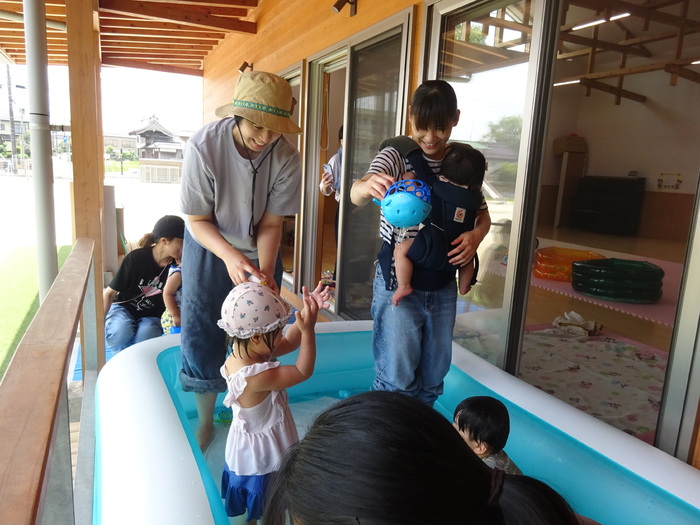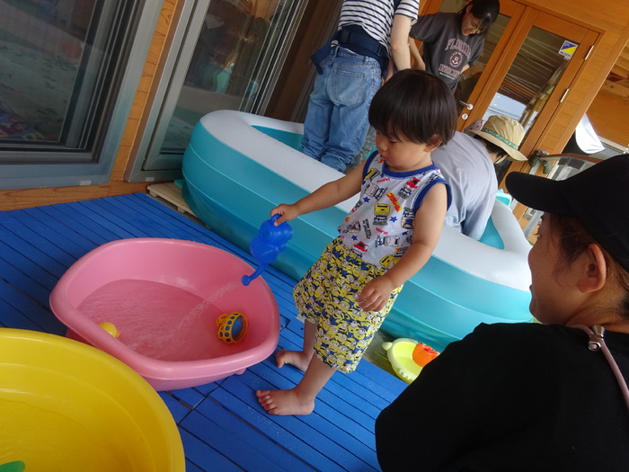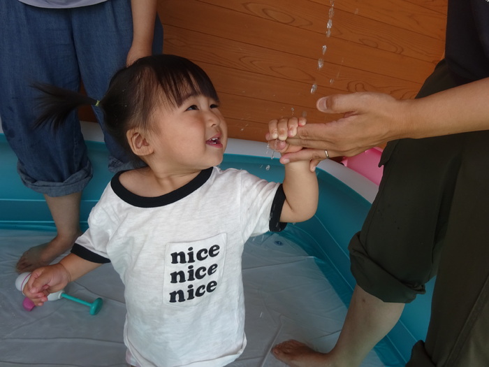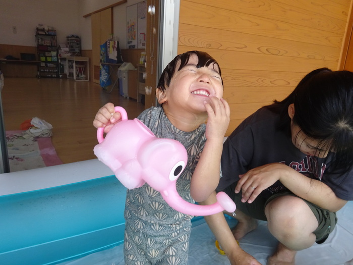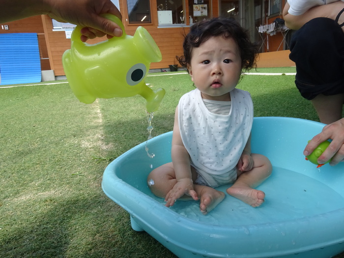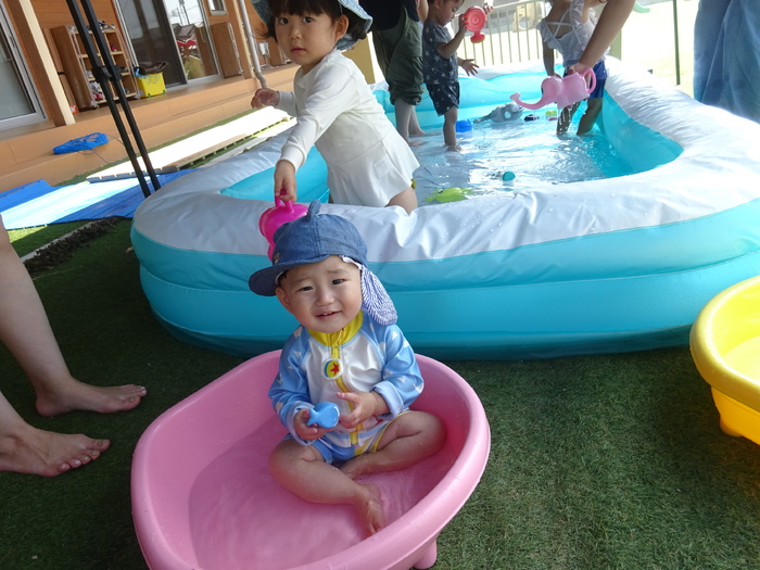 毎日暑い日が続く中、べビキッズ7・8月は 「水遊び」を行いました(^▽^)/ お水が冷たくてみんな楽しそうでしたよ♡ | ||