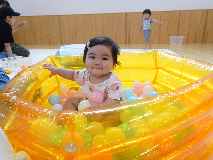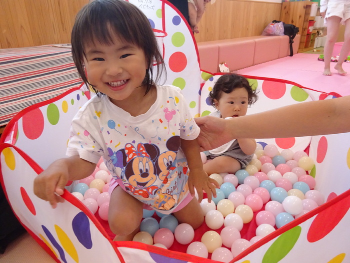 お水が苦手な子や、まだプールに入れない お友達のために、室内用ボールプールや 小さな水遊びグッズを用意しました★ | ||
