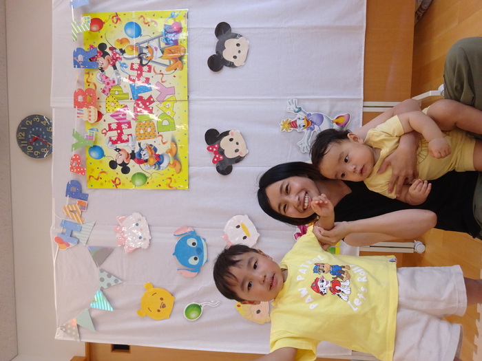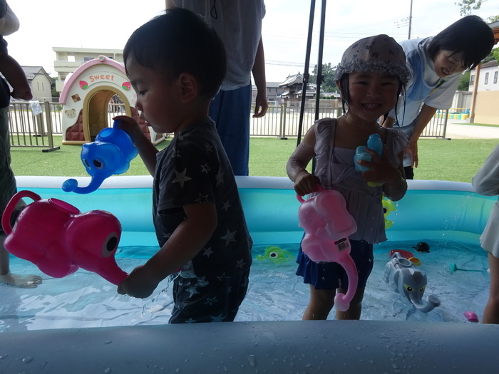 8月は誕生月のお友達のお祝いをしてから みんなで水遊びを行いました!!🍰 | ||