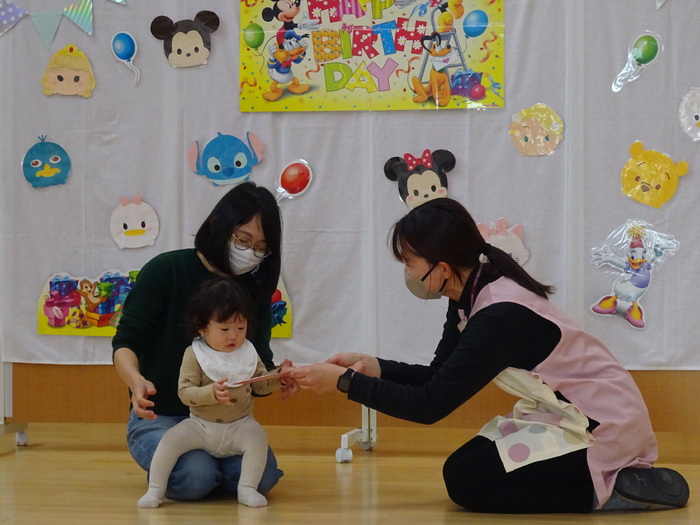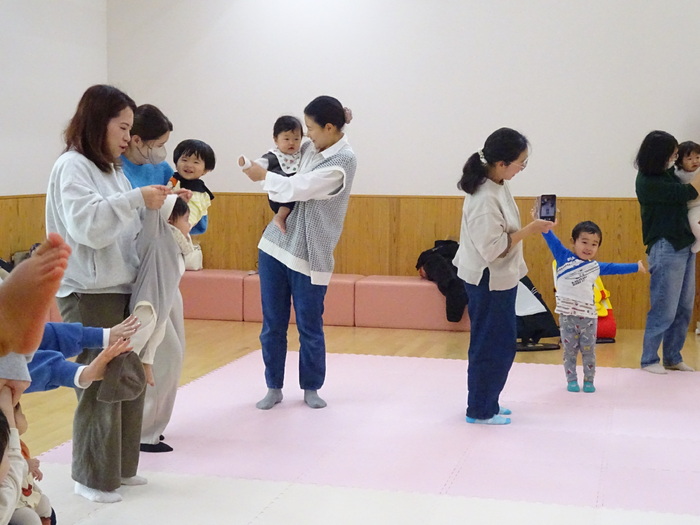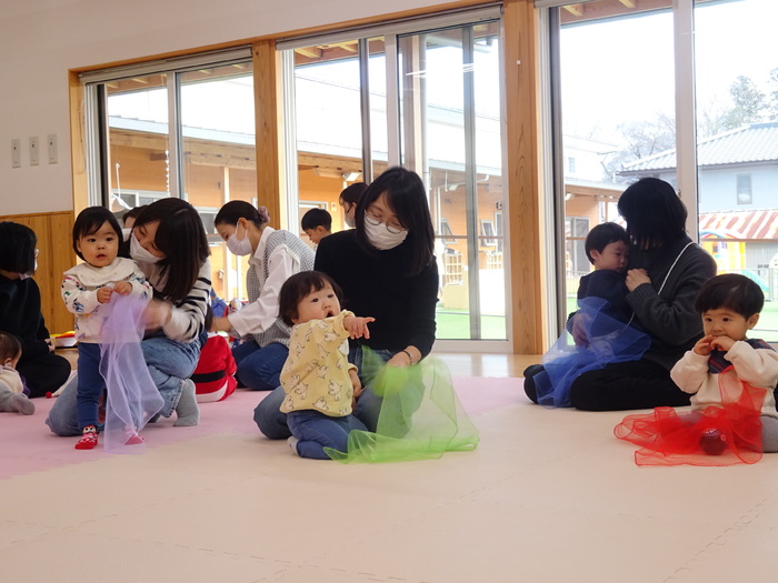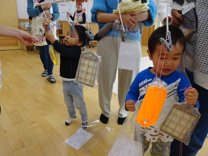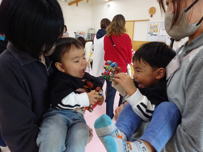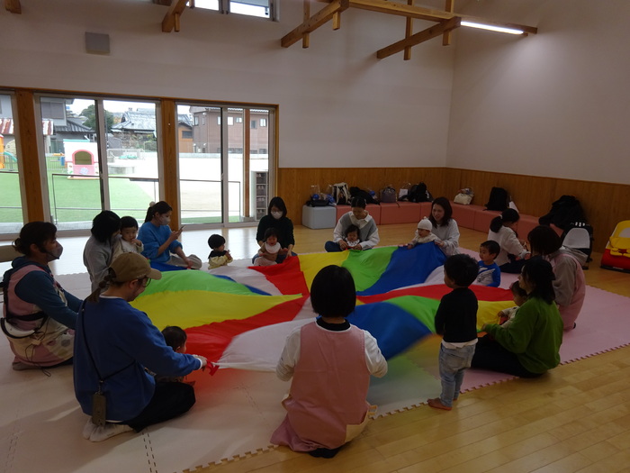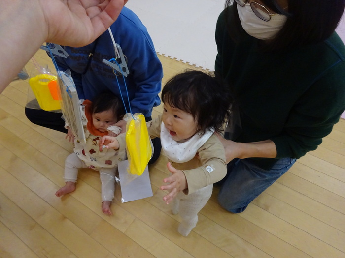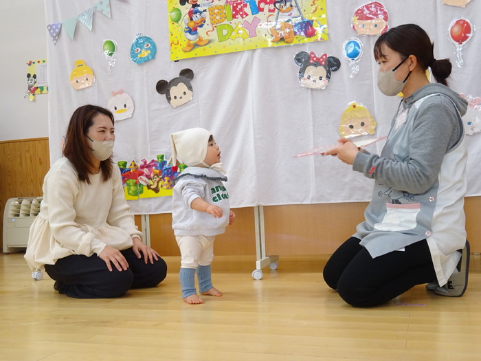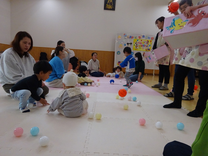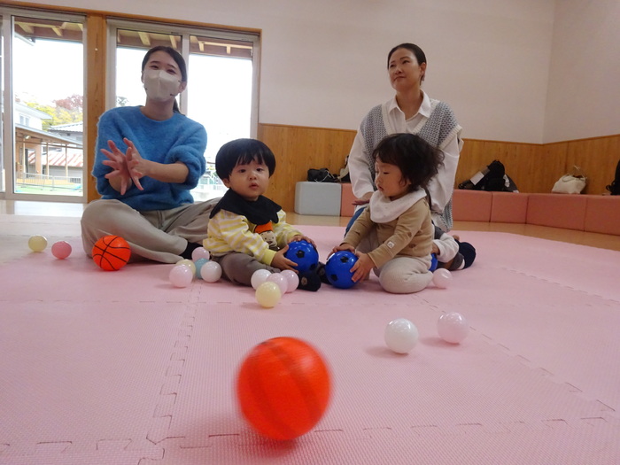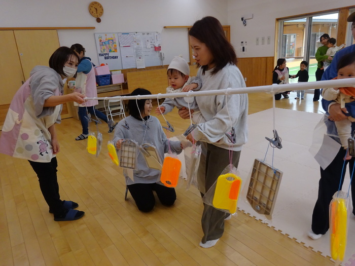 11月はミニ運動会でした。 お買い物レースでは、おままごとのおもちゃに向かって笑顔で競争! バルーンでは、みんなで体を動かしたりして楽しみました♪ | ||