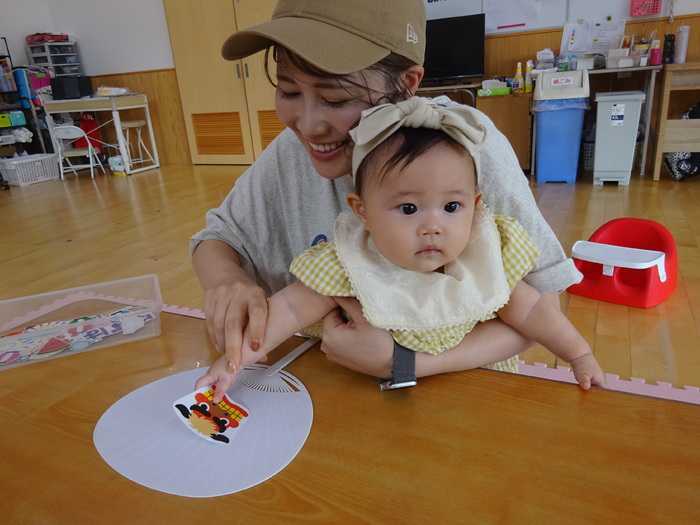 お祭りグッズはうちわ製作を行い、 ペタペタとステッカーを貼りました! | ||