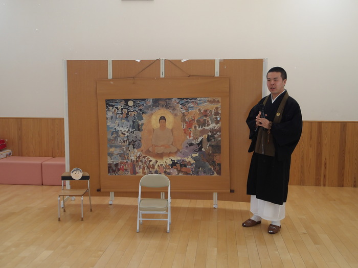 掛け軸を見ながら、成道会についての お話を聞きました。 成道会とは…… お釈迦様が『どうしたらみんなが幸せになれるか』を考え、 お悟りを開かれた日(12月8日)です。 | ||