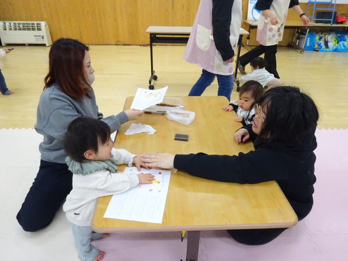 3月はお楽しみ会とスタンプアート‼ 登園してすぐに足形を取ってもらいました✨ みんな泣かずに取る事ができてびっくり‼ | ||
