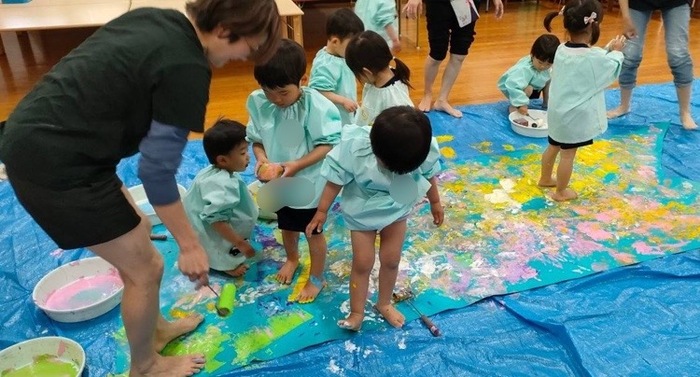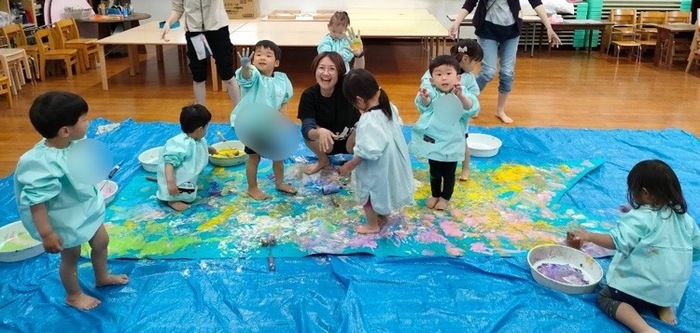 「屋根より~♪高~い 鯉のぼり~♪」ということで つぼみ組では 素敵な鯉のぼりを作ろう!と 絵の具遊びが始まりました 手や足にいろんな絵の具をつけてペタペタ ローラーやスポンジを使って絵の具をペタペタ ビー玉を転がして絵の具をコロコロ~ 素敵な鯉のぼりが完成🌟空高く舞いあがれ~ | ||