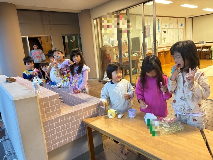 起きてすぐに布団を片付けて仲良く並んで歯ブラシ