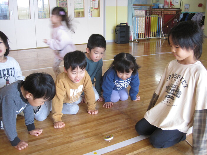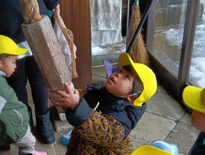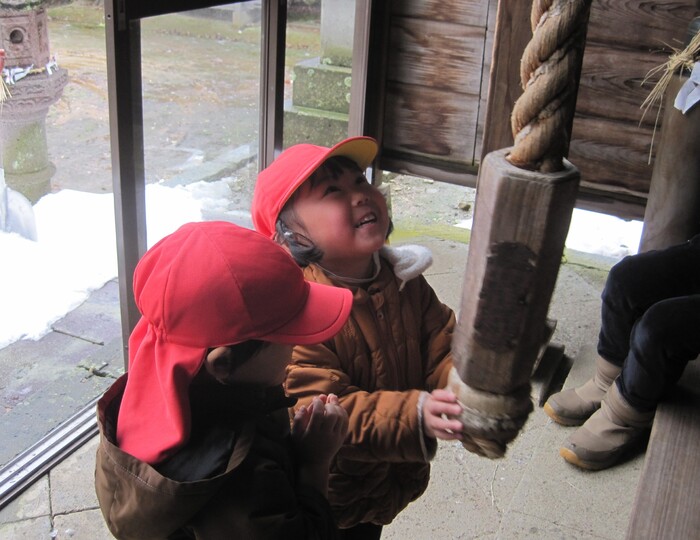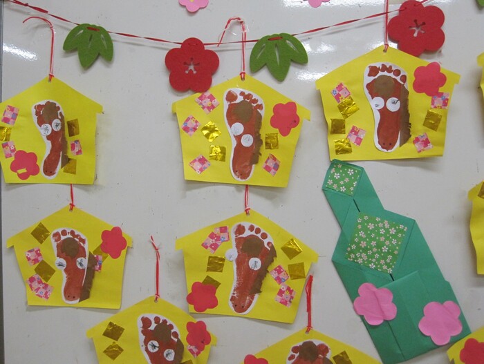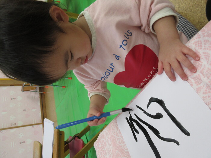 🎍初詣・お正月遊び🎍 新しい年の始まり、河南町の菅原神社に初詣に行ってきました。 「今年も元気に楽しく過ごせますように」と子ども達も小さな 手を合わせてお参りし、気持ちを新たにしていましたよ。お正月 遊びは最近では家庭で遊ぶ機会が減りましたが、保育園ではみん な興味津々です。かるた、福笑い、こま、けん玉など伝承遊びの 楽しさを味わい、年上児は小さなお友達に教えてあげる姿も見ら れましたよ。書初めや干支の製作も楽しみ、お正月の雰囲気を味 わいました。 | ||