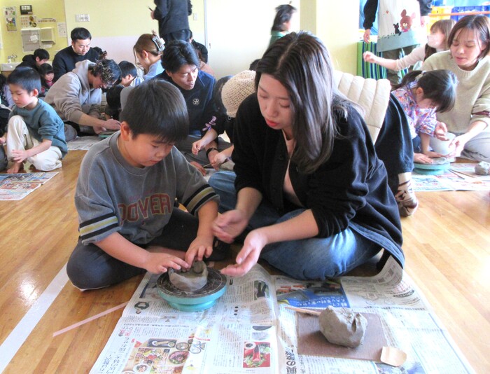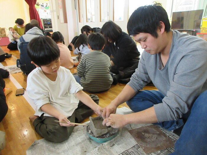 👧親子陶芸教室👦 5歳児あおばぐみの親子行事で陶芸体験を行いました。お父さん、 お母さんと一緒に「どんな形を作ろうかな?」「何色にする?」と 考えながら作り、親子でふれあいながら作りあげる楽しさを味わう ことが出来ました。世界にひとつだけの作品は卒園記念品として後 日完成予定です。焼きあがる日を楽しみにしているあおばぐみさん、 保育園での思い出がまたひとつ増えましたね! | ||