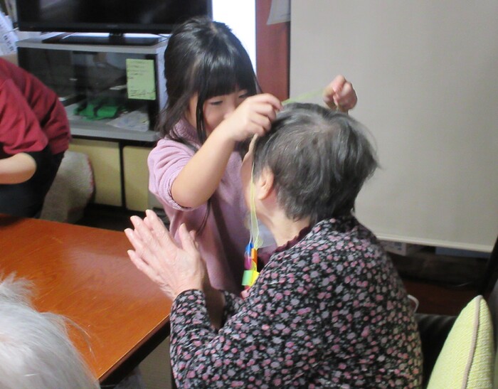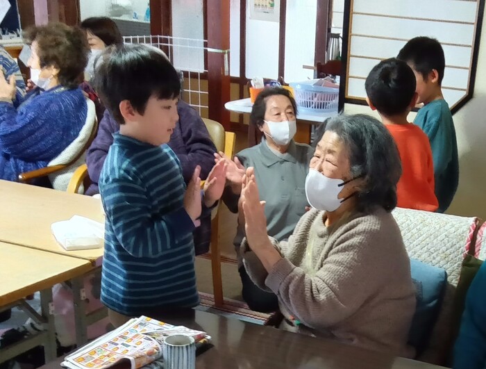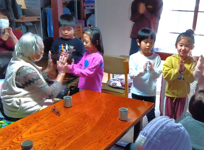 👴老人施設訪問👵 5歳児クラスが保育園の近くにある老人施設を訪問し、地域の 人々との交流を楽しんできました。子ども達の元気な歌声や プレゼントでおじいちゃんおばあちゃんも笑顔でいっぱいになり、 「元気を分けてもらえたよ」と喜んで頂けました。子ども達に とっても貴重な体験となり、良い思い出となったようです。 | ||