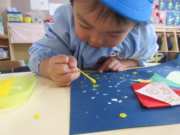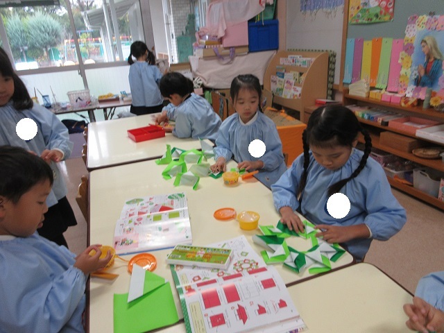 2025/12/16 風邪や熱でお休みするお友だちが増えていますが、行事を終えてのんびり遊ぶ時間を楽しんでいます。年長組の男の子たちの中で紙飛行機がブームです。ゴムをつけたり、折り方もいろいろ調べて遠くに飛ばす方法を考えて試しています。「かみひこうきバトルしよう!」と廊下にいってみんなで飛ばし競争。「やったー!」「あーまけた」「もういっかい」と毎日夢中になって勝負しています。 | ||
