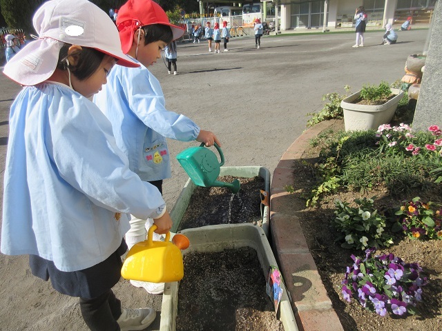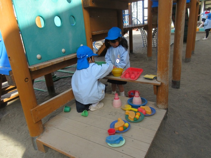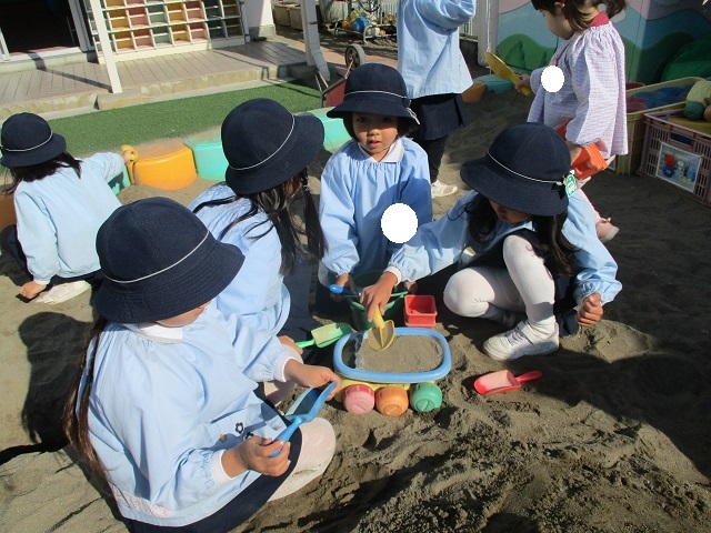 今日は、暖かい日差しで気持ちよく外遊びができました。土が乾いていることに気づいた子どもたちがお花に水をあげてくれました♬優しい心が育っていてうれしく思います。お砂場では年長さんの子どもたちが、「お砂場に根っこがあるから掘ってみよう!」と掘り進めているのをみていた年少さん、「いれて~」と参加。「こうやって掘るといいよ」とちゃんと掘り方を伝える年長さんの姿は頼もしかったです。遊びの中で異年齢の交流をたくさん経験して、お互いに育ちあっていってほしいです。 | ||