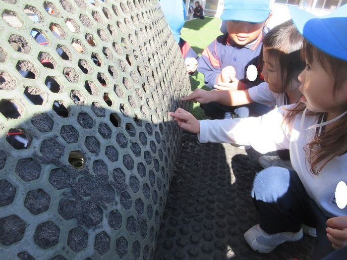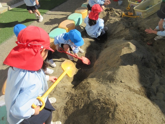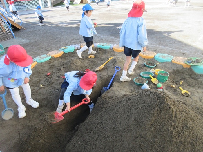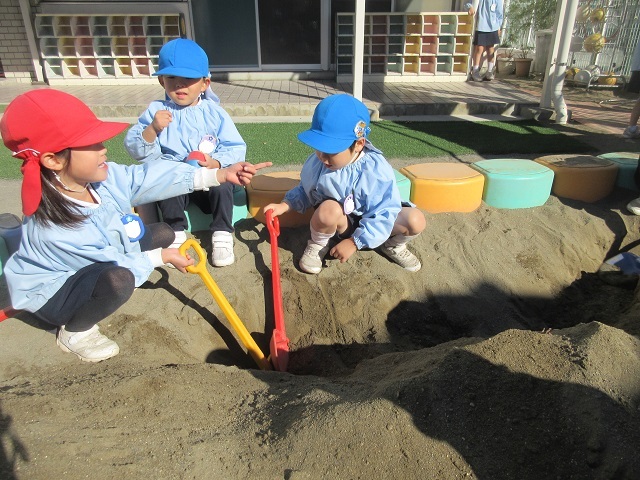 外遊びでは、年長組が元気にドッジボールや砂場で元気に遊んでいました。砂場では長い時間掘り進めていき、「すなばのいちばんしたまでとどいたよ。」ついに底がみえたと大喜びの子どもたちでした♬ | ||