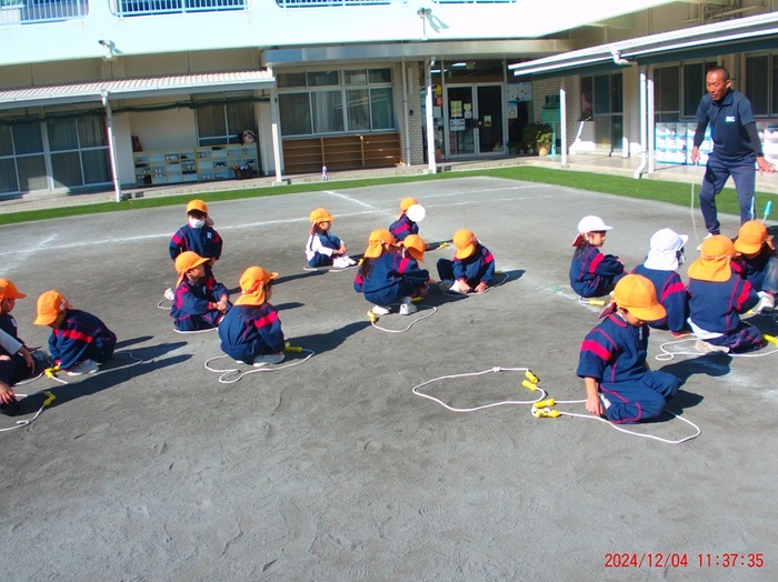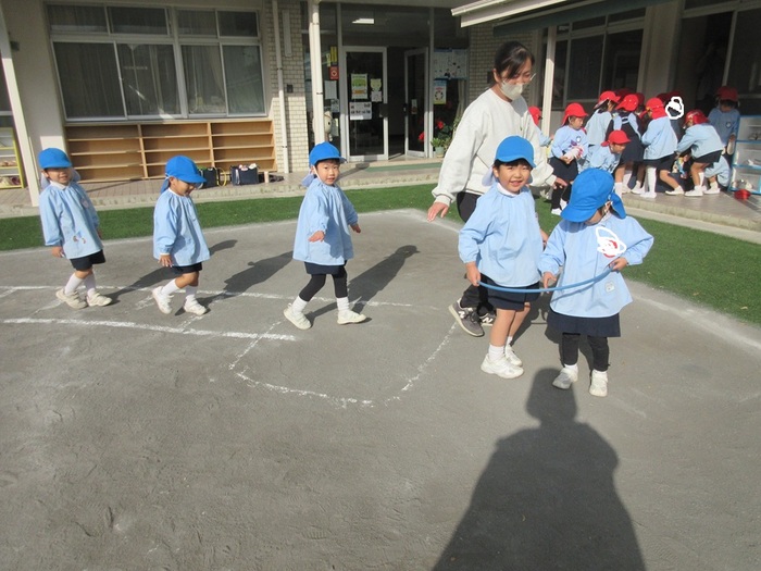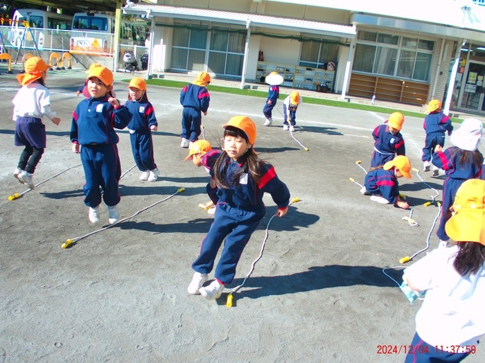2025/12/5 朝夕は寒さを感じるようになりましたが、日中は暖かく、お日様の下で子どもたちも元気に遊んでいます! 年中さんは、縄跳びの練習をしました! 前跳び、後ろ跳び、走り跳び、一つひとつを一生懸命練習してみんなとっても上手になってきました♡ | ||