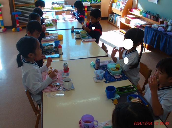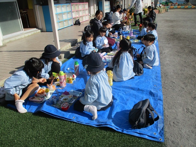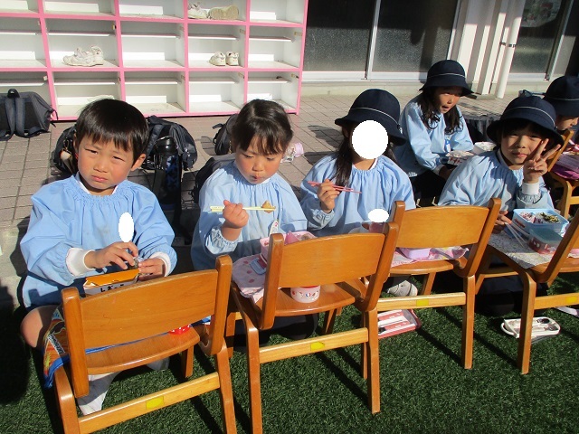 預かり保育のお昼は、青空の下テラスでおいしく食べました。 | ||