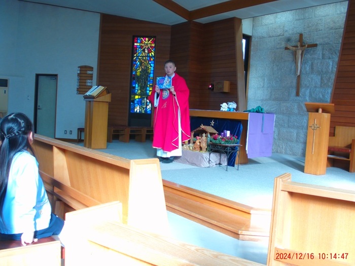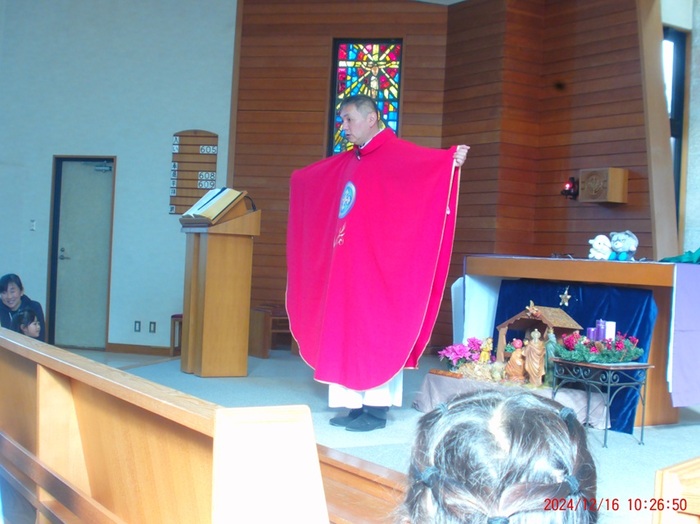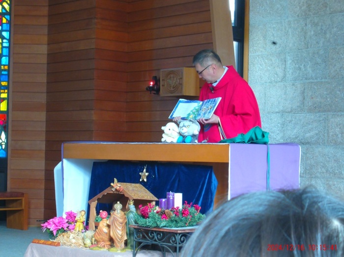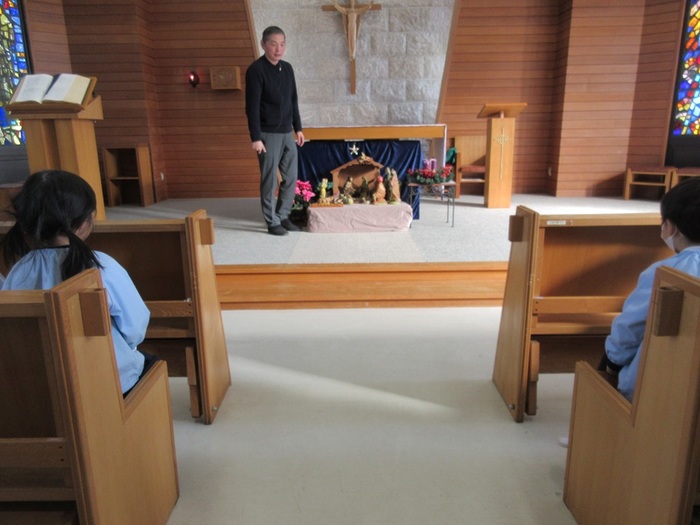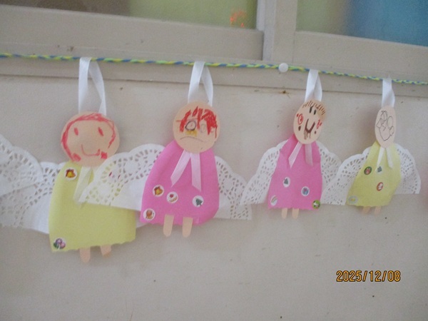 2025/12/10 今日は教会で園長先生より神様のお話しをしていただきました。 クリスマスはイエス様のご誕生をお祝いする日です。馬小屋、聖家族について改めてお話を聞きクリスマス当日までどの様なお心で過ごしたら良いのか?みんなで考えました。 「お友だちに優しくする」「仲良く遊ぶ」「お手伝いをする」みんなの素敵なお心。 きっとイエス様に届いて喜んでくださっていますね‼ | ||