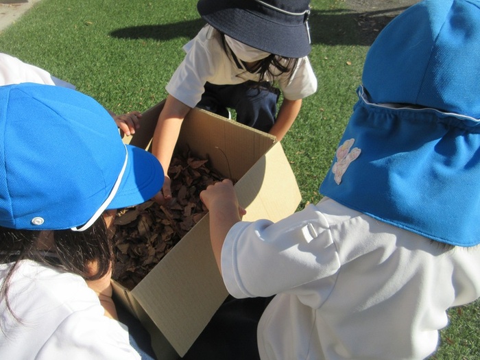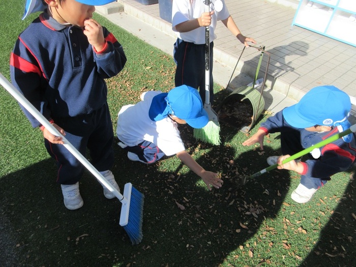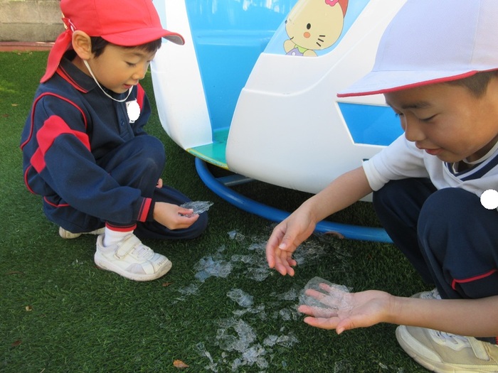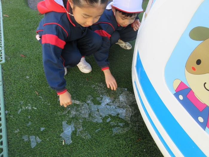 2025/12/15 寒くなり水たまりに氷ができていました!「うわぁ~氷だ‼」と嬉しそうに駆け寄り手に取って、氷の感触を楽しみました。薄くて透き通ったきれいな氷。あっという間に溶けてしまいました。 園庭には風が運んできた落ち葉がいっぱい!カブトムシの幼虫のごはんにしようと落ち葉集めをしました。 年少組の子どもたちも大きなほうきを上手に使って集めていました。 また、園庭のマットに詰まった土を見つけて型抜きを楽しむ可愛い姿もありました♡ 今日はあちこちで自然の恵みを発見して遊んだ一日になりました♪ | ||