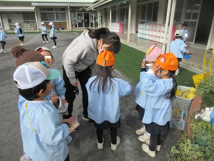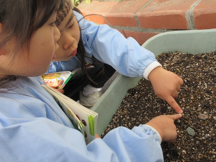 年少組は動物さん帽子を被って虫探し。「てんとうむしつかまえるの」と園庭をお散歩をしていると、プランターに植えたフリージアの芽が出ているのに気づいてしゃがみ込みました。「芽が出てるねー」「ほんとうだ💛」ちゃんと、植物の生長に目を向けられるなんて素敵ですね🥰 | ||
