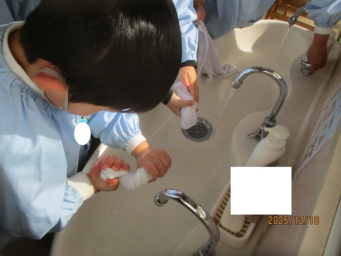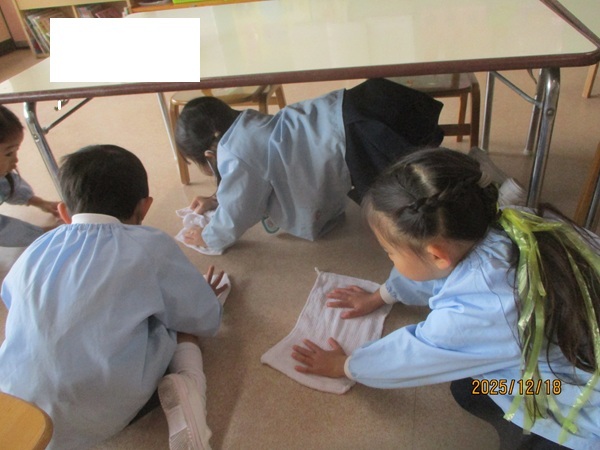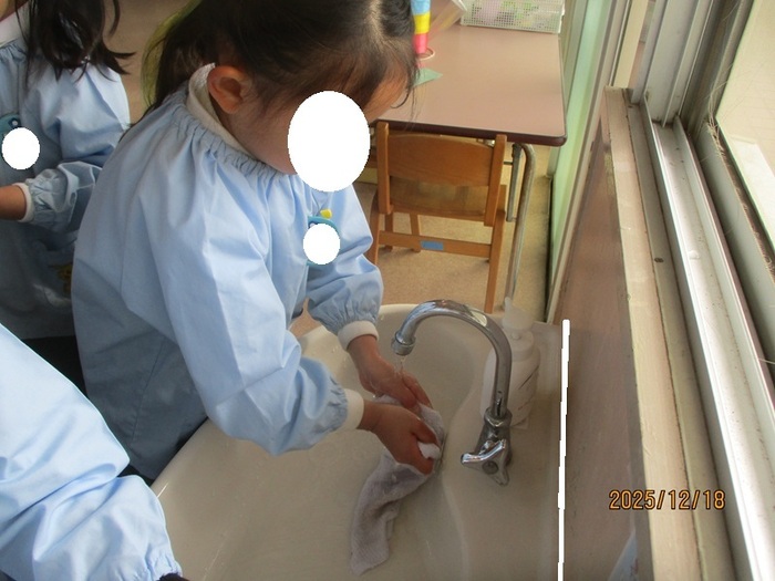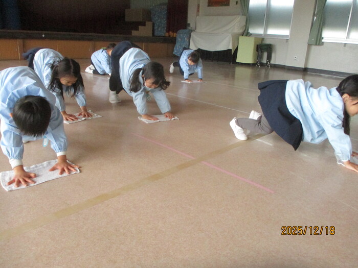 いよいよ来週から冬休みに入ります。 みんなで「いつも使っているお部屋をきれいにしようね」「ありがとうの気持ちを込めてお掃除しようね」と話すと、雑巾を手に床やロッカーを一生懸命きれいにしてくれました✨ 最後は、雑巾を洗って絞ることもできました! 気持ちよく新しい年を迎えられそうです。 | ||